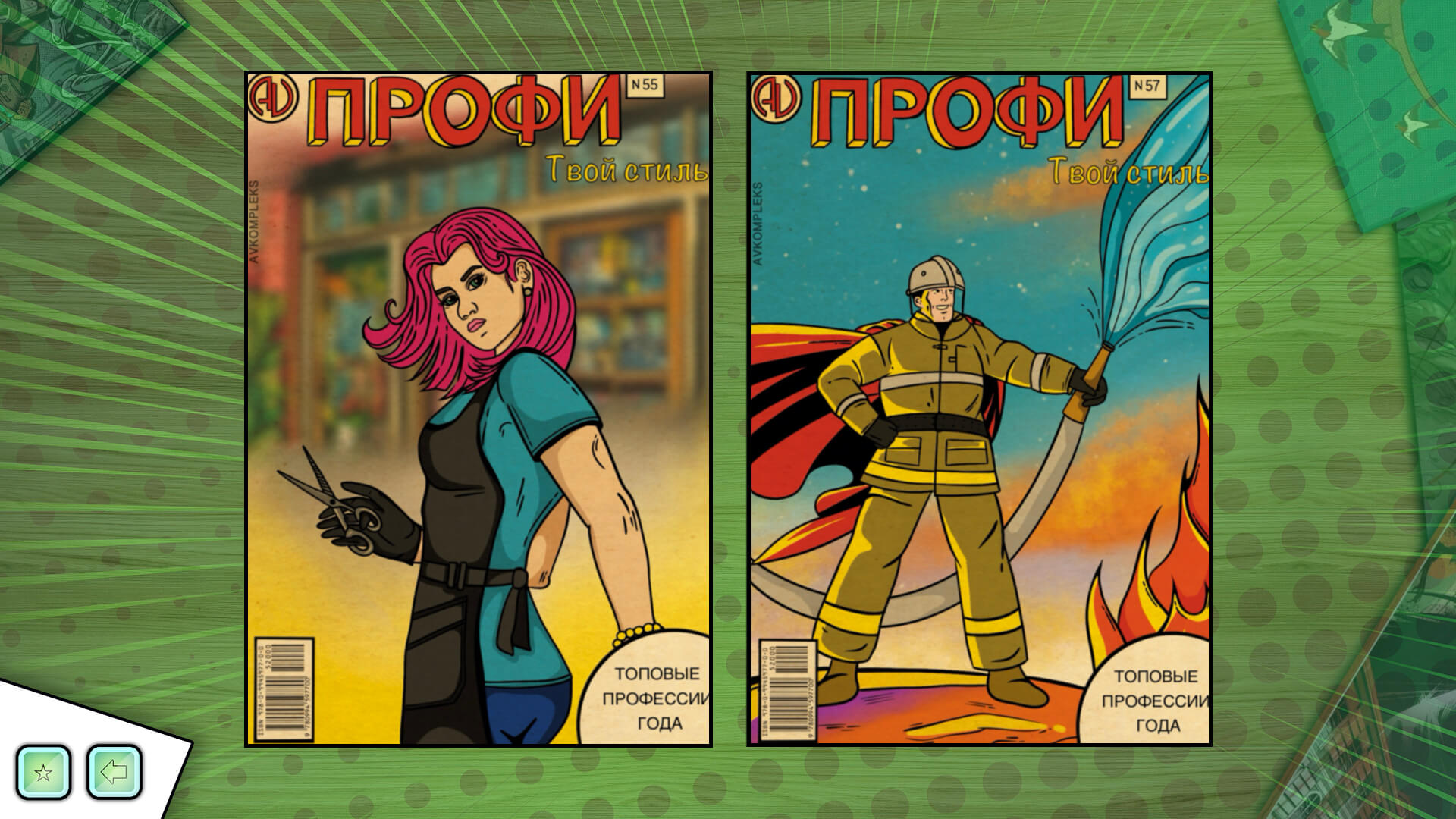 Упражнение выполнено в стилистике всем известной бумажной игры с переодеваниями персонажей в различные костюмы. На выбор представлены женский и мужской персонажи, по умолчанию без униформы. Задача игрока пользуясь представленным перечнем иллюстраций одежды, одеть персонажа в костюм профессии, название которой будет появляться на табличке персонажа-помощника Белочки.
