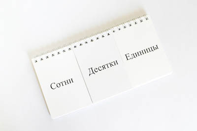 Пособие состоит из 3 стопок карточек с цифрами от 0 до 9. Каждая стопка начинается карточкой с названием разряда (единицы, десятки, сотни). Также в состав пособия входят карточки с математическими знаками и 2 обложки, выполненные из картона. Подробнее