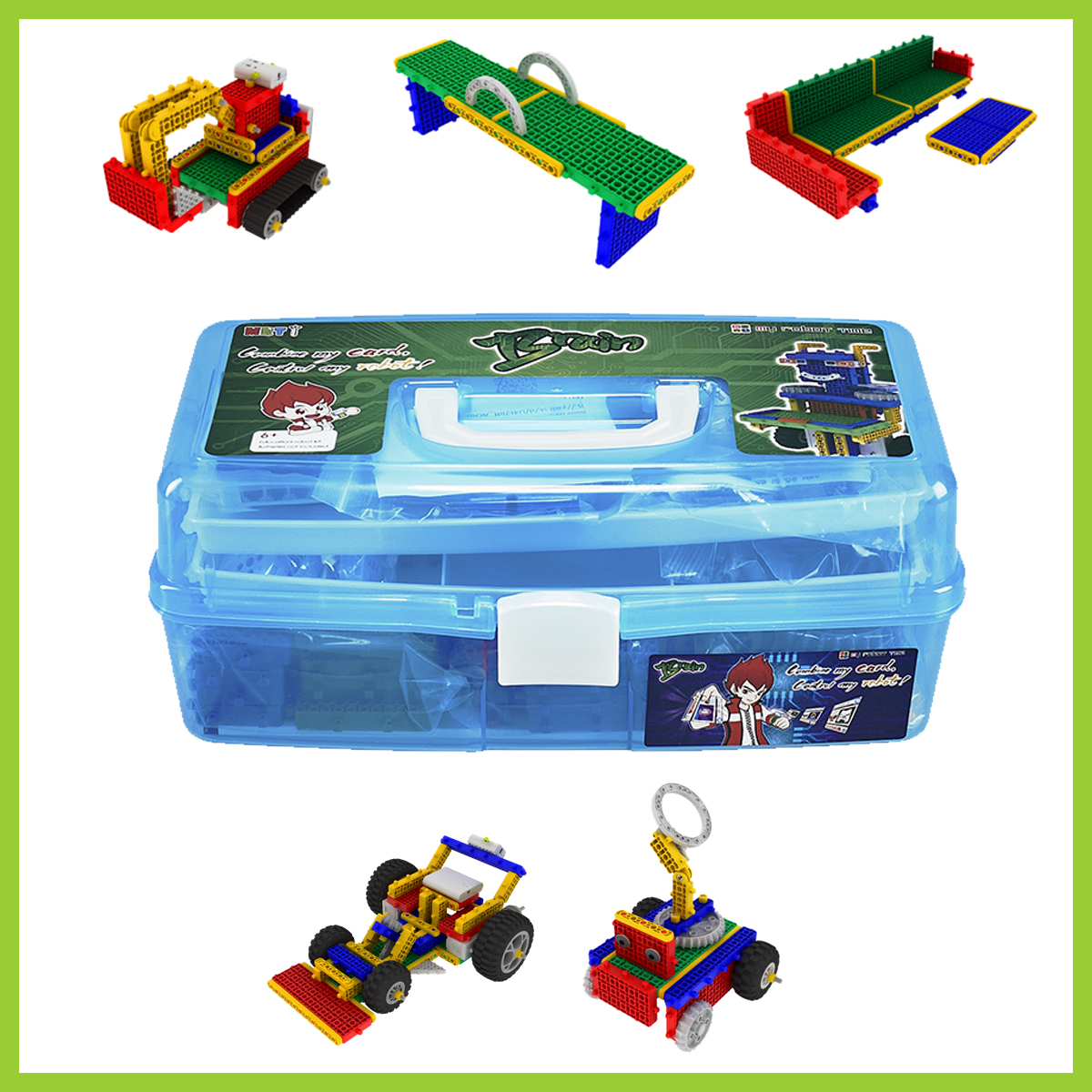 Набор состоит из не менее чем 180 деталей, и включает в себя крупные пластиковые блоки. Модели можно программировать с помощью специальных карточек.