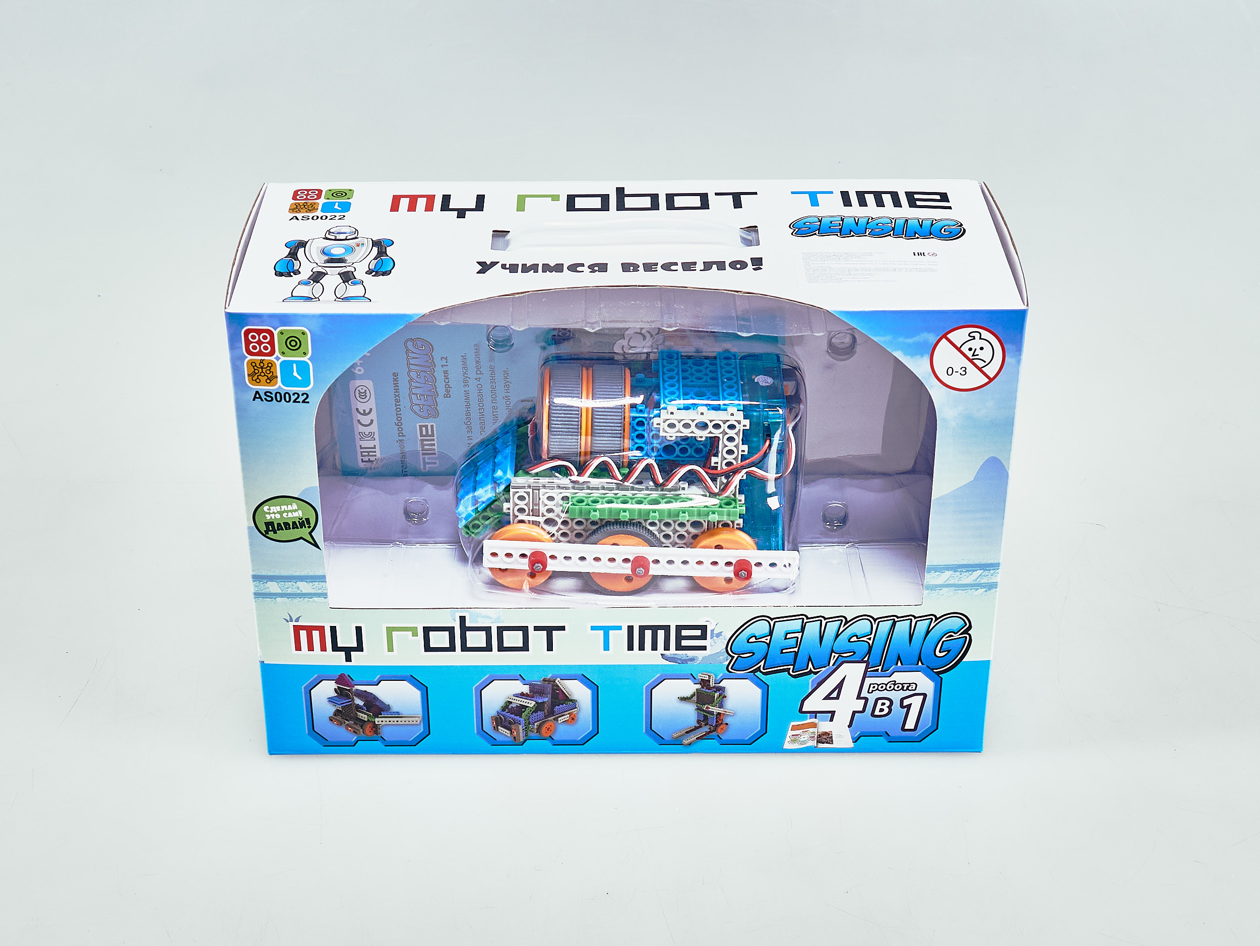 My Robot Time sensing . состоит из не менее 133 деталей (упрощены схемы сборки по просьбе родителей), в т.ч. материнская плата, 2 DC двигателя, 2 IR-датчика. Иллюстрированная брошюра по сборке.