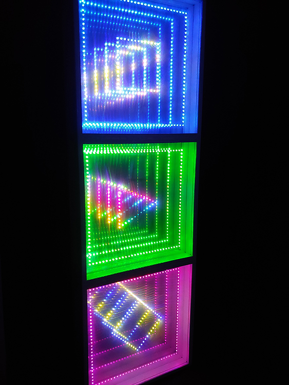 Интерактивное панно бесконечность настенное с шестью секторами имитирующими бесконечные тоннели. Потрясающие визуальные эффекты особенно завораживают именно в темной сенсорной комнате. Управление полностью независимое. Можно все тоннели сделать одного цвета, либо задать каждому из них свой отдельный, либо отключить и включить выборочно. Наружные управляются сенсорным колесом с сотнями цветовых оттенков, внутренние обладают более чем 150 эффектами бегущих огней, имитации огненного колеса, догоняющие друг друга отдельные огни, меняющие цвет лабиринты и т.д. Все контуры управляются при помощи пультов ДУ. Внутренние тоннели различных геометрических форм. Управление яркостью, скоростью смены эффектов.