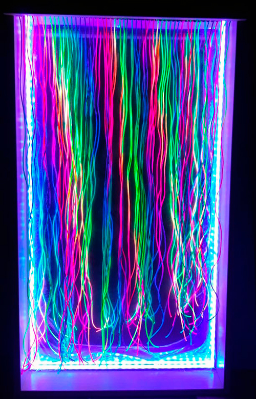 Настенное панно со светящимися в УФ излучении шнурами на фоне небъющегося зеркала. ПВХ шнуры засвечиваются по всей длине в полной темноте, цвет каждого меняется на всем протяжении. Короб полностью закрыт, нити зафиксированы. Источник света - лента с безопасным напряжением в 12 вольт.
