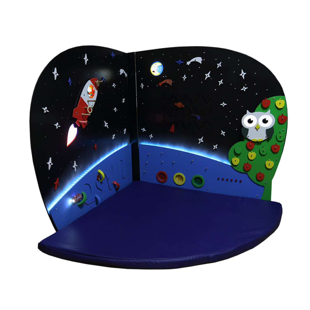 Тактильно-развивающий детский игровой комплекс «Ночь» предназначен для детей дошкольного и младшего школьного возраста для использования в составе темных сенсорных и игровых комнат. Общая художественная тематика комплекса: ночное звездное небо и другое ночное оформление. Состоит из двух игровых зон, которые можно располагать как под углом 90°, так и под 180° – на плоскую стену. Комплекс сочетает в себе множество развивающих элементов познавательной и развивающей направленности: движение по прорезям Монтессори, интерактивные световые элементы, зажигающиеся от кнопок, открывающиеся замочки-крючки, надевание на штырьки, тактильные ячейки, где надо наощупь идентифицировать предмет. Подробнее