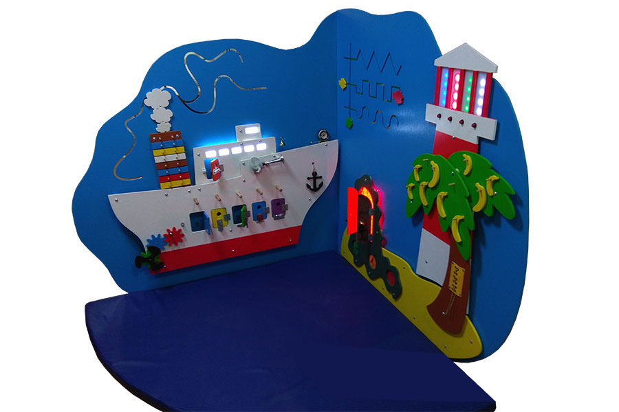 Комплекс сочетает в себе множество развивающих элементов познавательной и развивающей направленности: движение по прорези Монтессори, интерактивные световые элементы, зажигающиеся от кнопок, открывающиеся замочки-крючки, надевание на штырьки, шестеренки, тактильные ячейки, где надо наощупь идентифицировать предмет.
