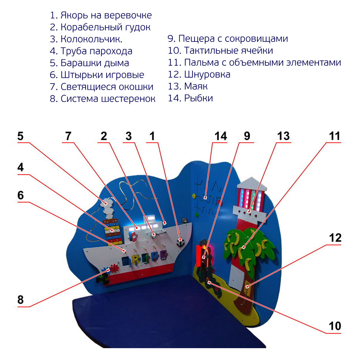 В левой игровой зоне основным элементом является яркий праздничный пароход, на котором расположены:
