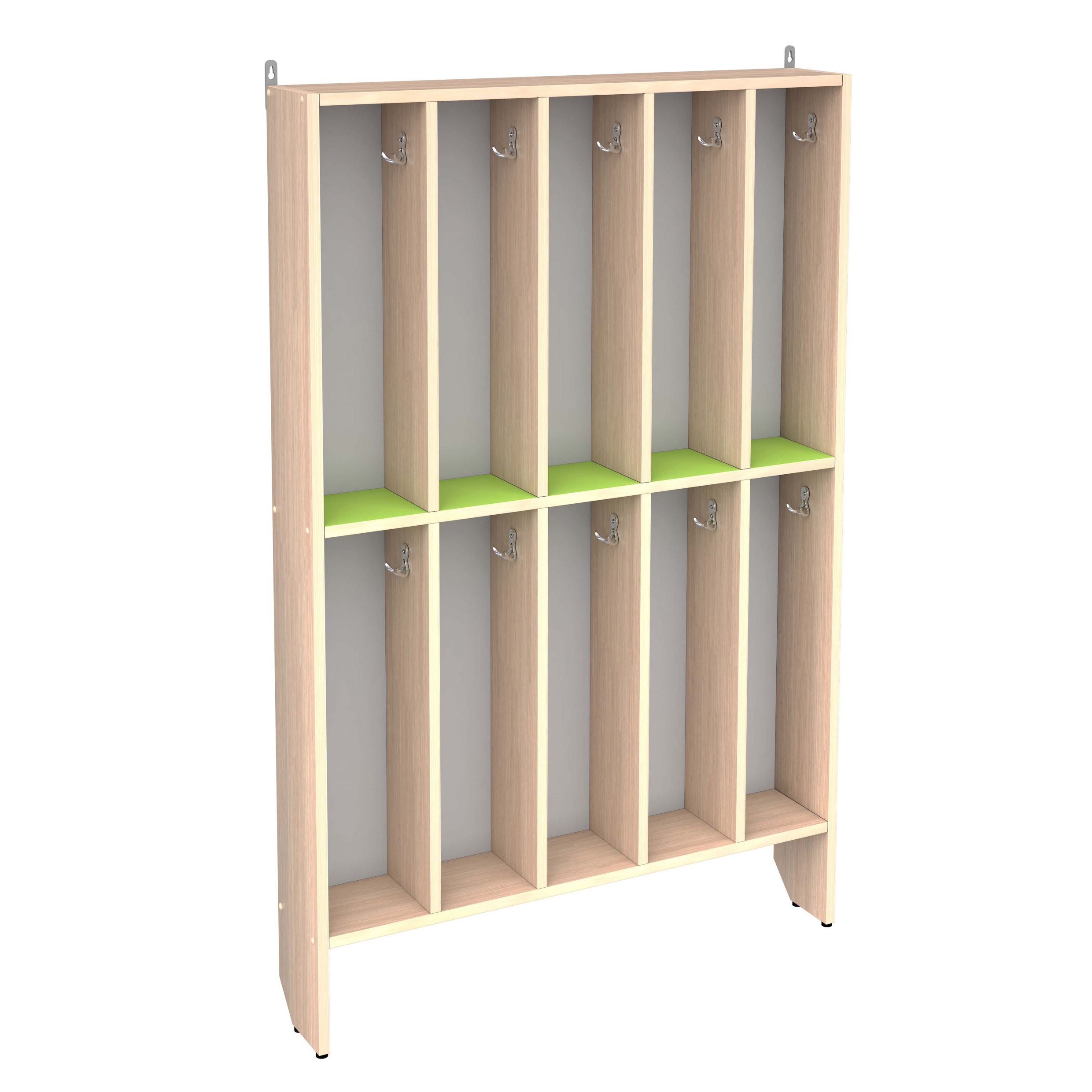 ЛДСП 16 мм, кромка ПВХ 0,4 мм, задняя стенка ХДФ 3,2 мм, в каждой ячейке крючок, ширина ячейки 120 мм, высота 500 мм, от пола до нижней полки 150 мм.