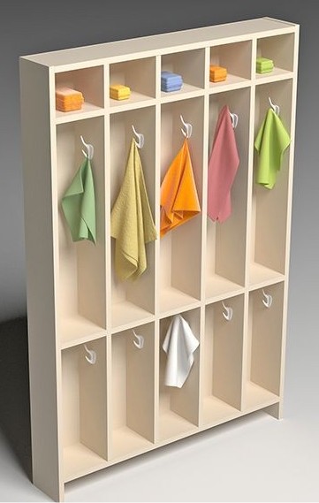 ЛДСП 16 мм, кромка ПВХ 0,4 мм, задняя стенка ХДФ 3,2 мм, в каждой ячейке крючок, ячейка Ш120 мм, Н500 мм, полочка Н120 мм, от пола до нижней полки 150 мм.