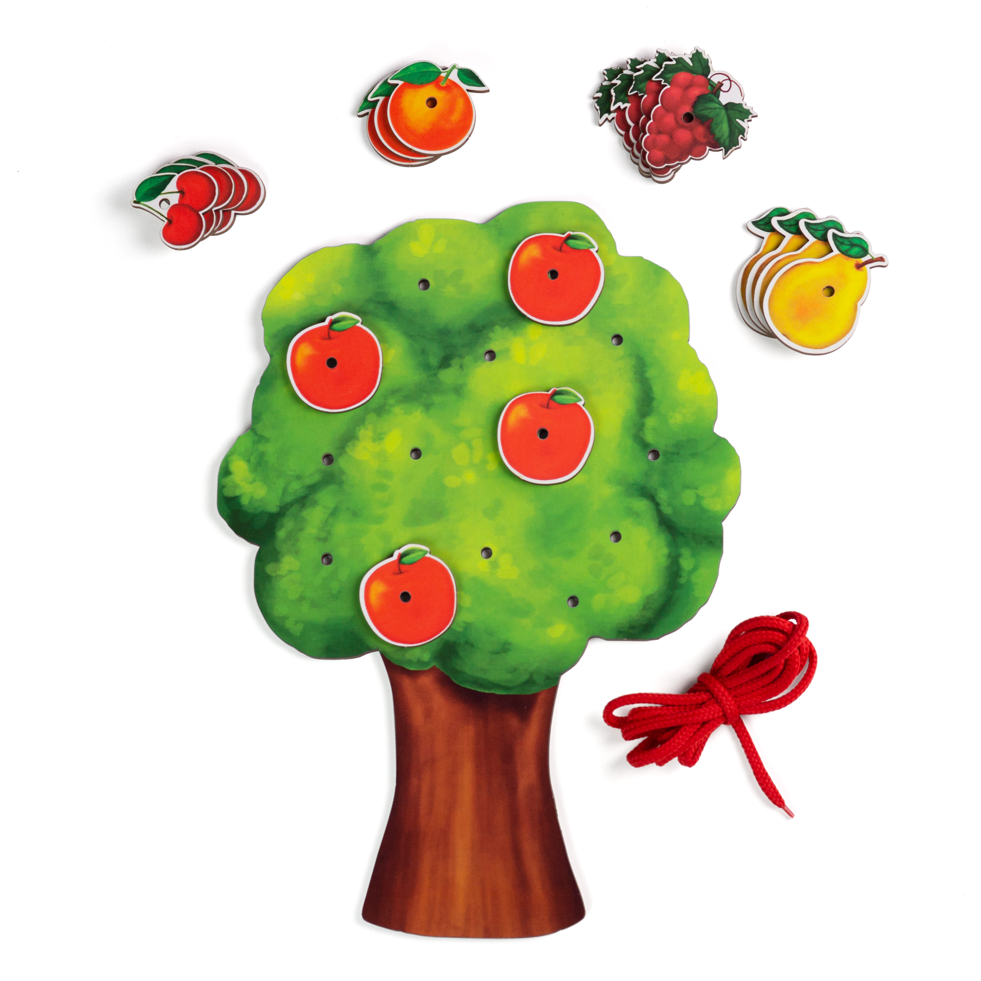 Фигурки фруктов и ягод с отверстиями для продевания шнурка: яблоки, персики, мандарины, виноград, груши, вишня.