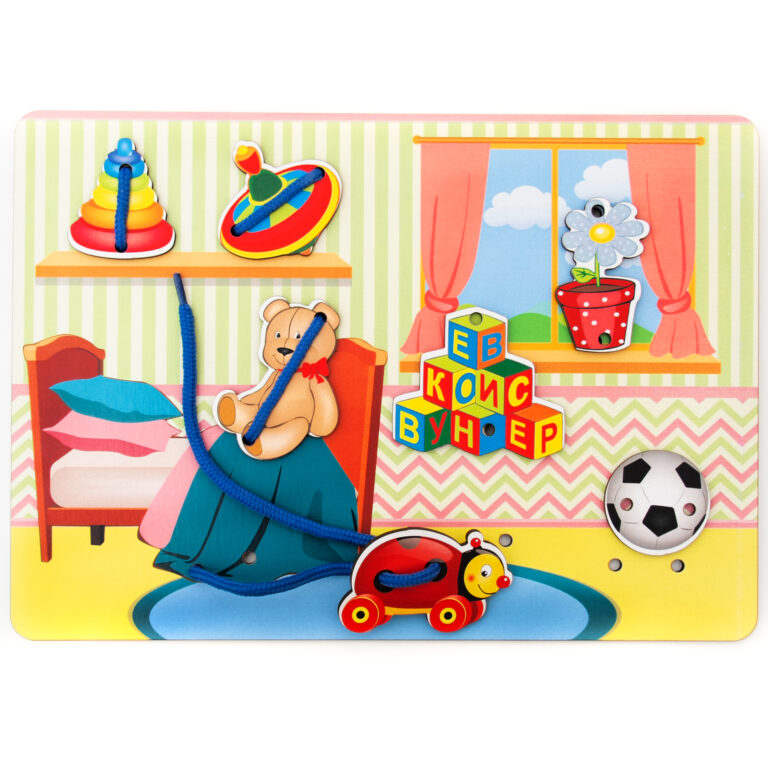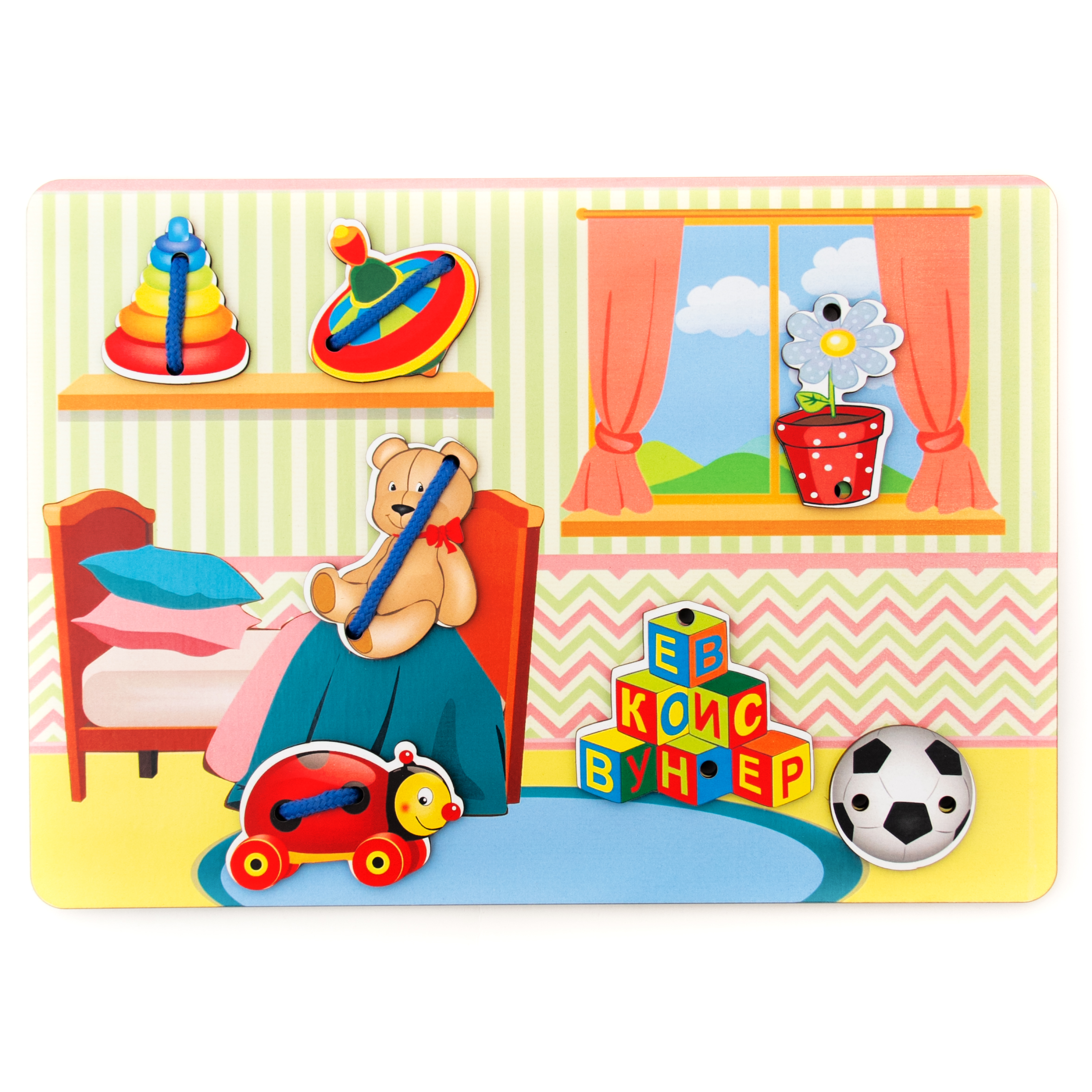 Деревянная панель с изображением детской комнаты и отверстиями для продевания шнурка – 1 шт.;