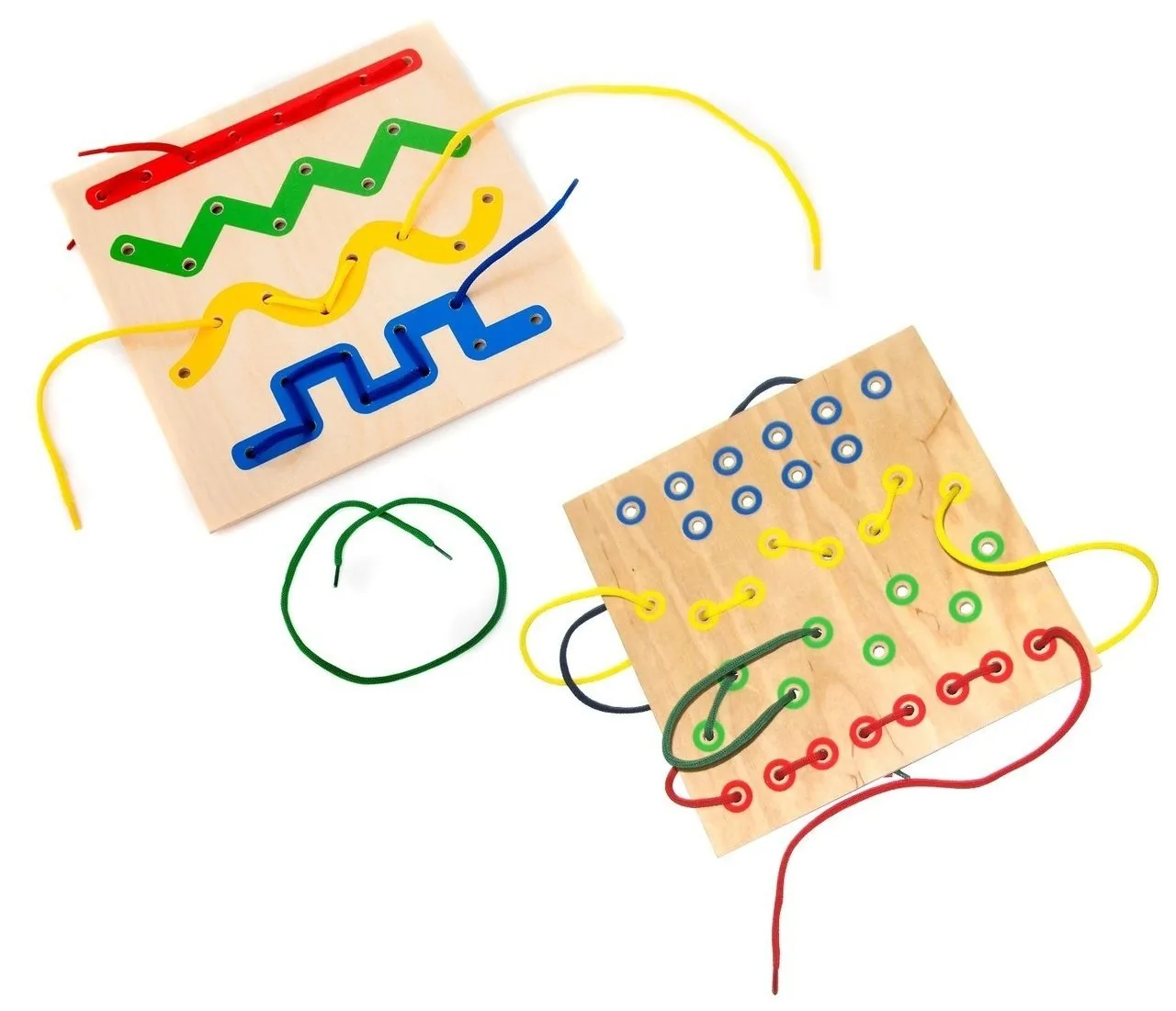 Этот деревянный планшет разработан педагогами работающих по системе Монтессори. В нем просверлены 34 отверстия. Все дырочки разделяются на 4 отдельные группы, которые нужно соединить шнурочком. Каждая группа имеет свой отдельный цвет и узор. Первый - красная прямая линия. Второй - зеленый зигзаг. Третий - желтая волнистая линия. Четвертый - синяя ломаная линия. Спутать, которым шнурочком шнуровать какую группу - невозможно, так как с обратной стороны дырочки разрисованные соответствующими цветами.