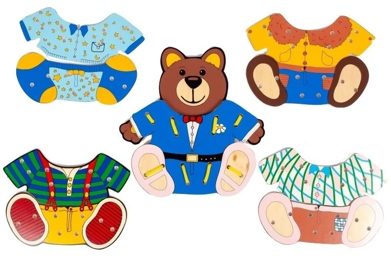 Пособие состоит из пяти накладных частей одежды, основы мишки и шнурка. С помощью шнурка и специальных дырочек пришнуруйте мишке симпатичные кофточку и штанишки.