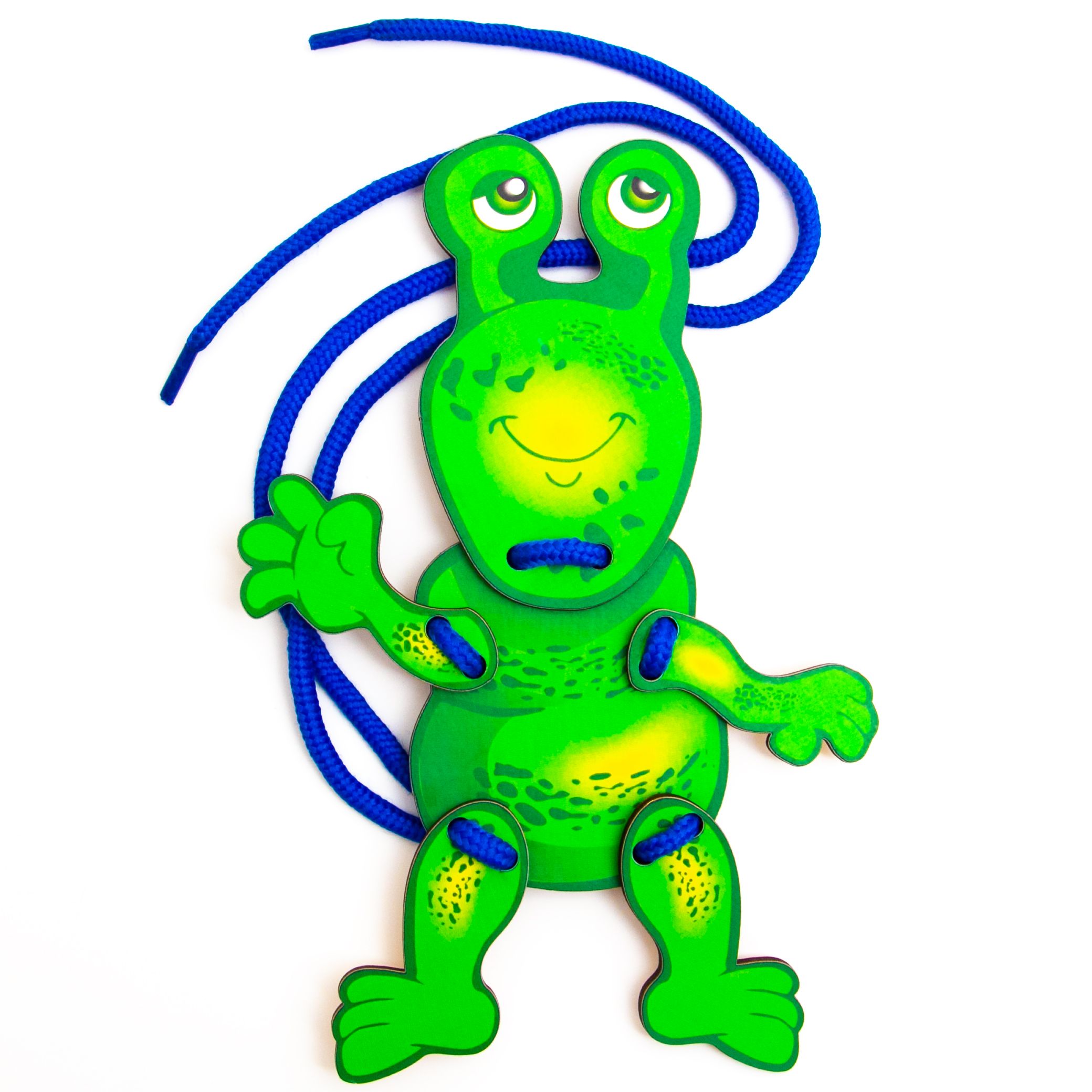 2. Предложите ребенку расположить детали (части игрушки) на ровной поверхности (стол, диван, ковер, пол). Затем попросите сложить в нужном порядке так, чтобы получился герой - Семен Зеленыч. Далее, после того как ребенок составил верно все тело, попросите соединить детали шнурком, могут быть разные вариации. Если ребенку сложно это сделать самостоятельно, помогайте и демонстрируйте, как это должно быть.