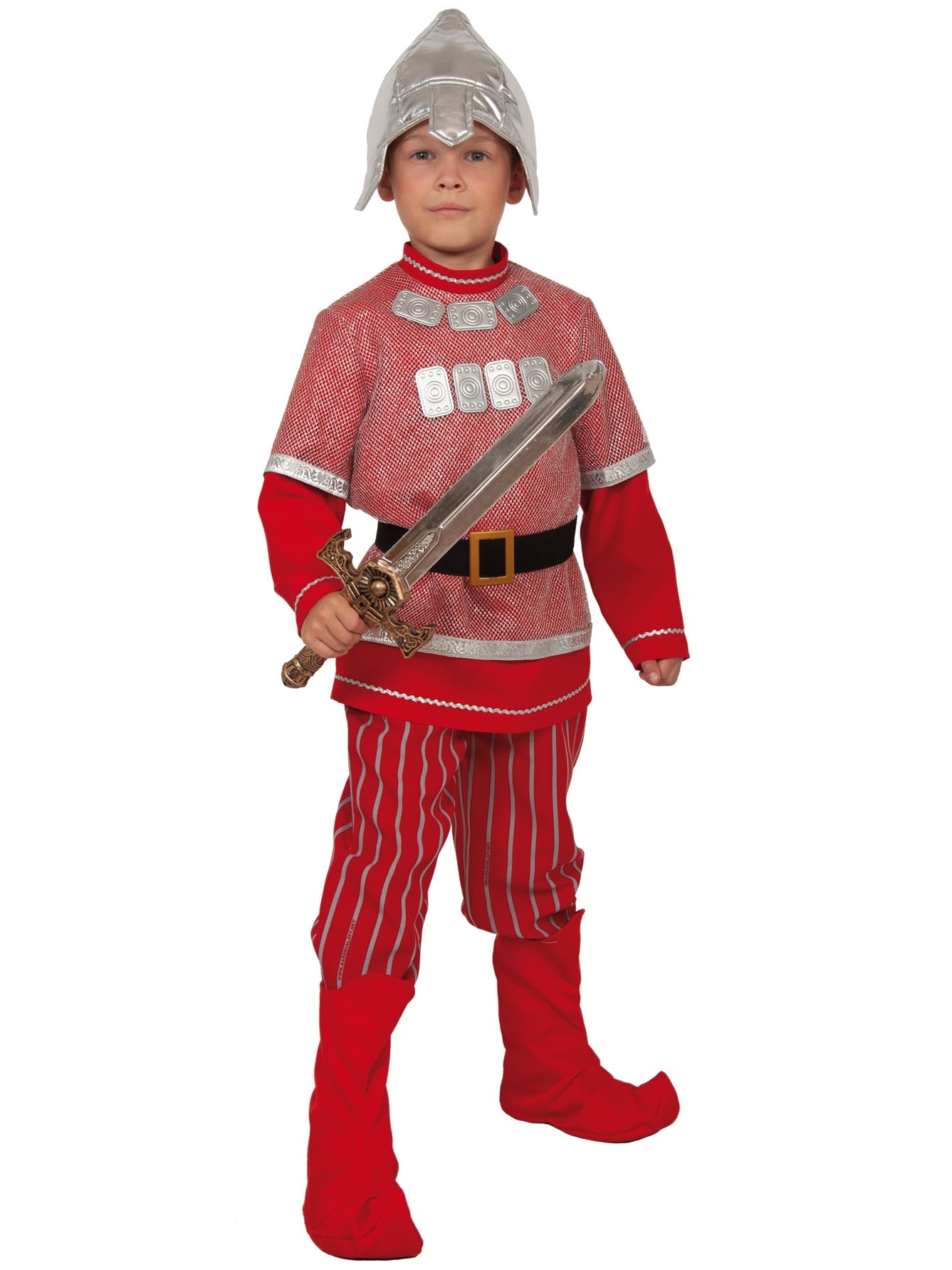 шапка-шлем, рубаха-кольчуга с рукавами, брюки, пояс, сапоги текстильные, меч богатыря