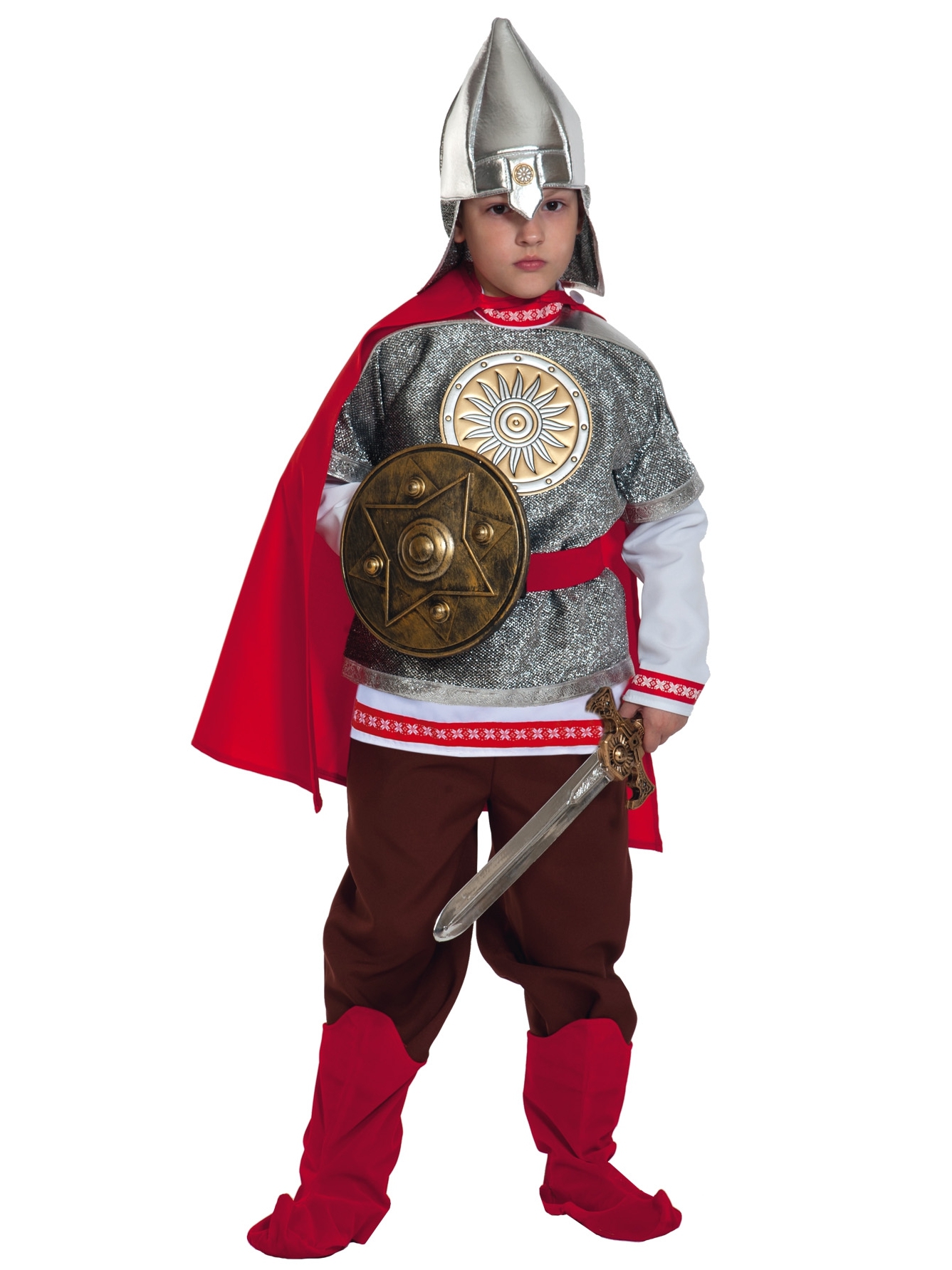 шапка-шлем, рубаха-кольчуга с рукавами, брюки, накидка, пояс, сапоги текстильные, щит и меч