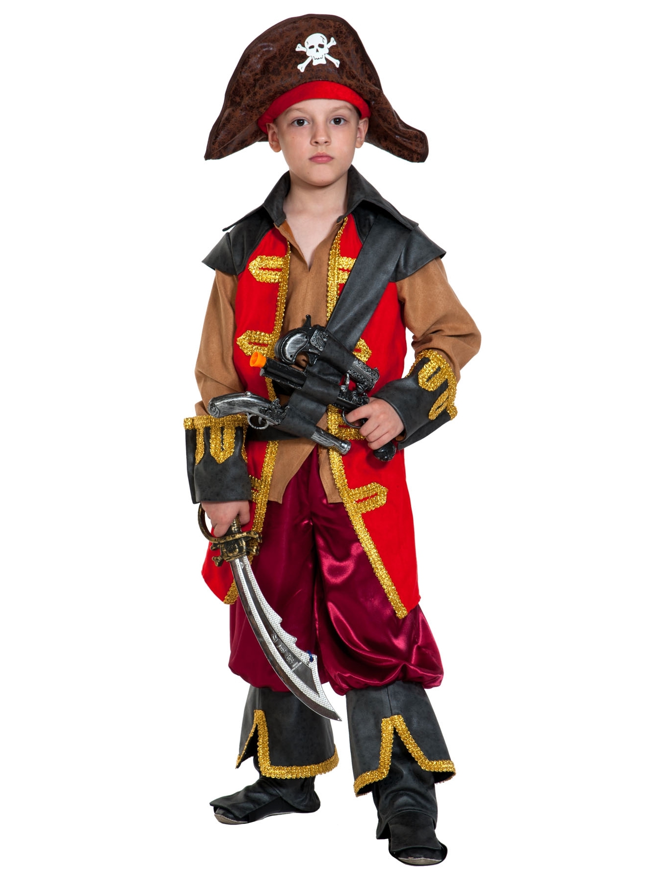 Треуголка, камзол, пояс, штаны с ботфортами, наплечный ремень, 3 мушкета + сабля пирата