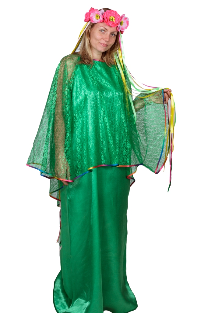 Размер: длина изделия 145 см, ширина в области груди 120 см, длина рукава 74 см, ширина рукава под проймой 64 см, венок: длина ободка 54 см, ленты длиной от 75 до 120 см.