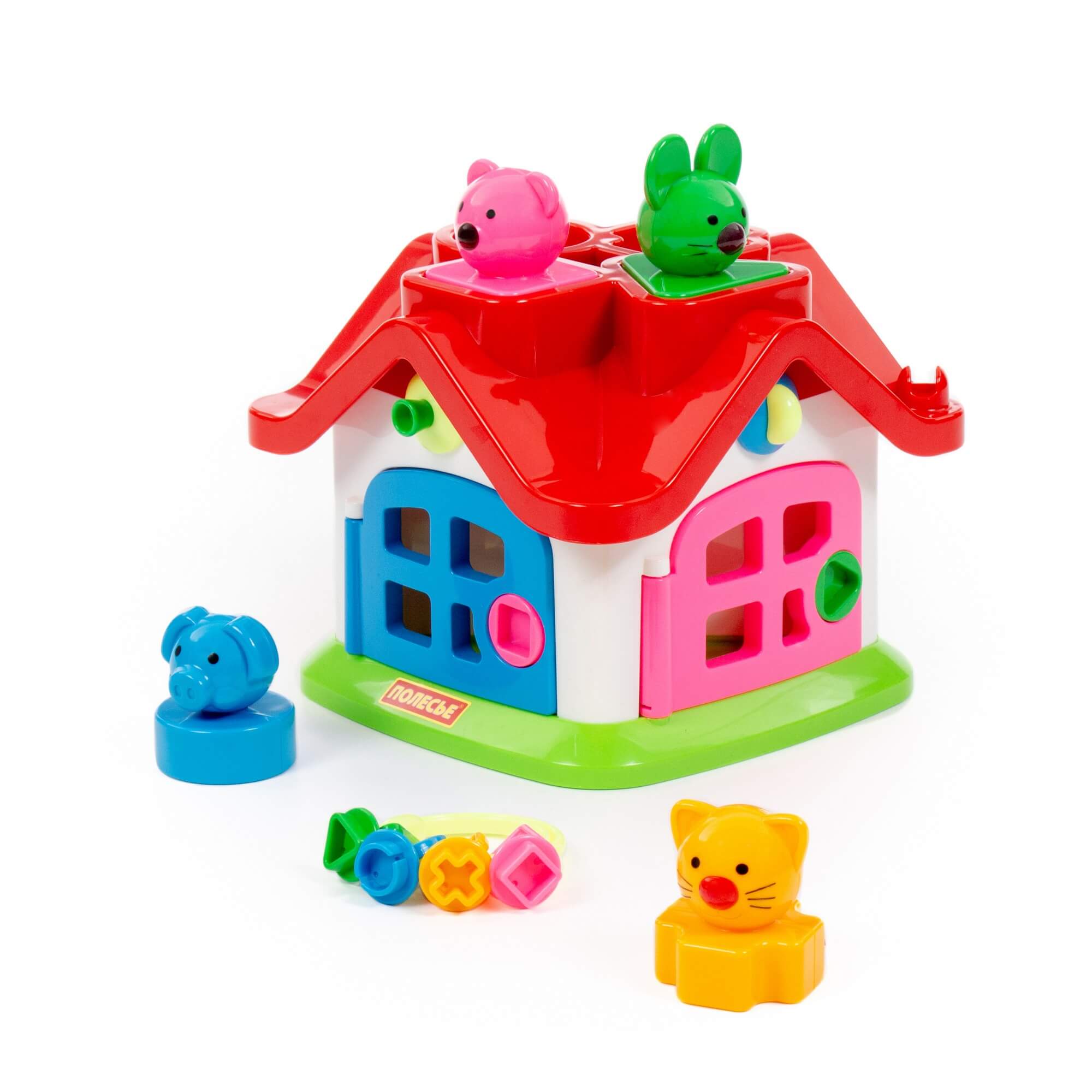 Яркий цветной теремок с 4 дверками на замочках и зверушками знакомит ребёнка с цветами, формами, звуками, развивает мелкую моторику рук, воображение, логику, умение совершать пространственные перемещения. Внутри теремок разбит на 4 комнаты. За каждой дверкой есть жилец: мишка, зайчик, кошка, поросёнок. В теремок они попадают через отверстия в крыше: сажаем их в дырочку, нажимаем на кнопочку для каждого своя и зверёк проскакивает в комнату. По желанию в теремок можно войти и через дверку. Высота зверюшек 6 см. У каждого зверя основание определённой формы: у зайца в основе - треугольник, у поросёнка - кружок, у котёнка - крест, у мишки - квадрат.
