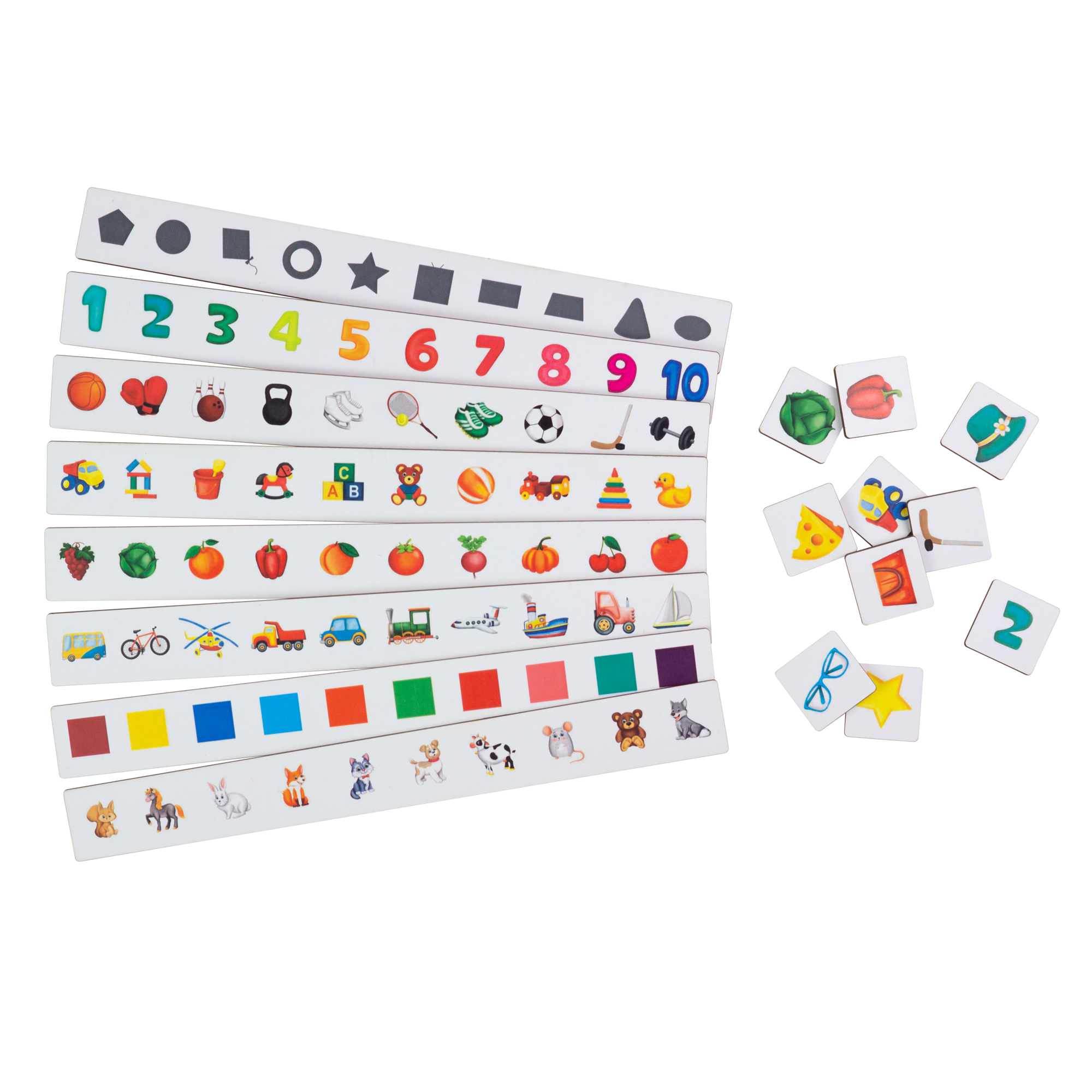 Линейки – образцы для сортировки квадратиков - фишек, по темам – 8 шт. Темы для сортировки: животные, овощи – фрукты, спорт, игрушки, цифры, цвета, транспорт, геометрические фигуры.