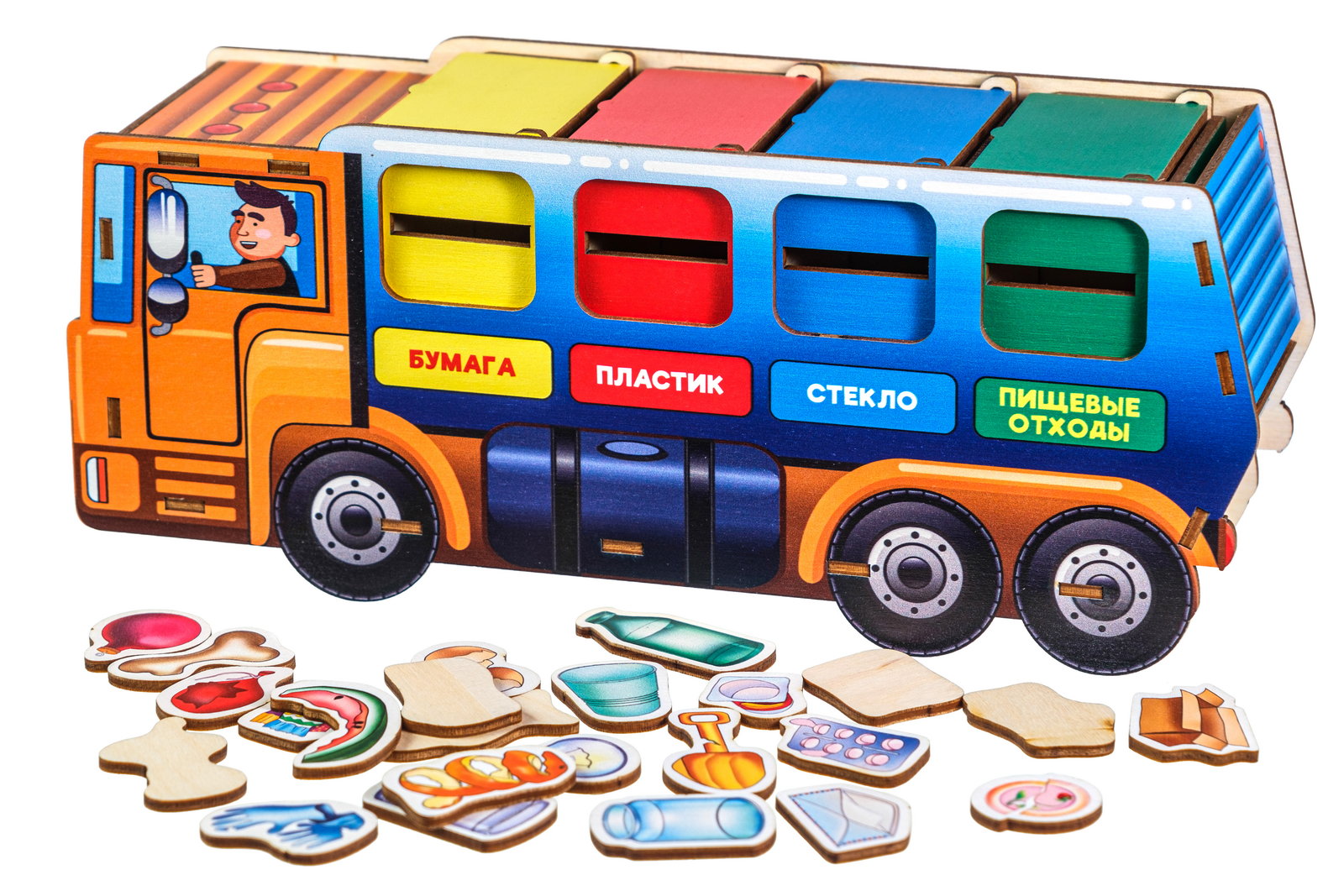 1. Игра «Мусоровоз». Рассмотрите мусоровоз вместе с ребенком. Обсудите его назначение. Достаньте фигурки с изображением мусора и назовите все предметы. Посчитайте контейнеры на мусоровозе, уточните их названия. Спросите, что можно выбрасывать в контейнеры? (Бумажные, пластиковые, стеклянные предметы, пищевые отходы).