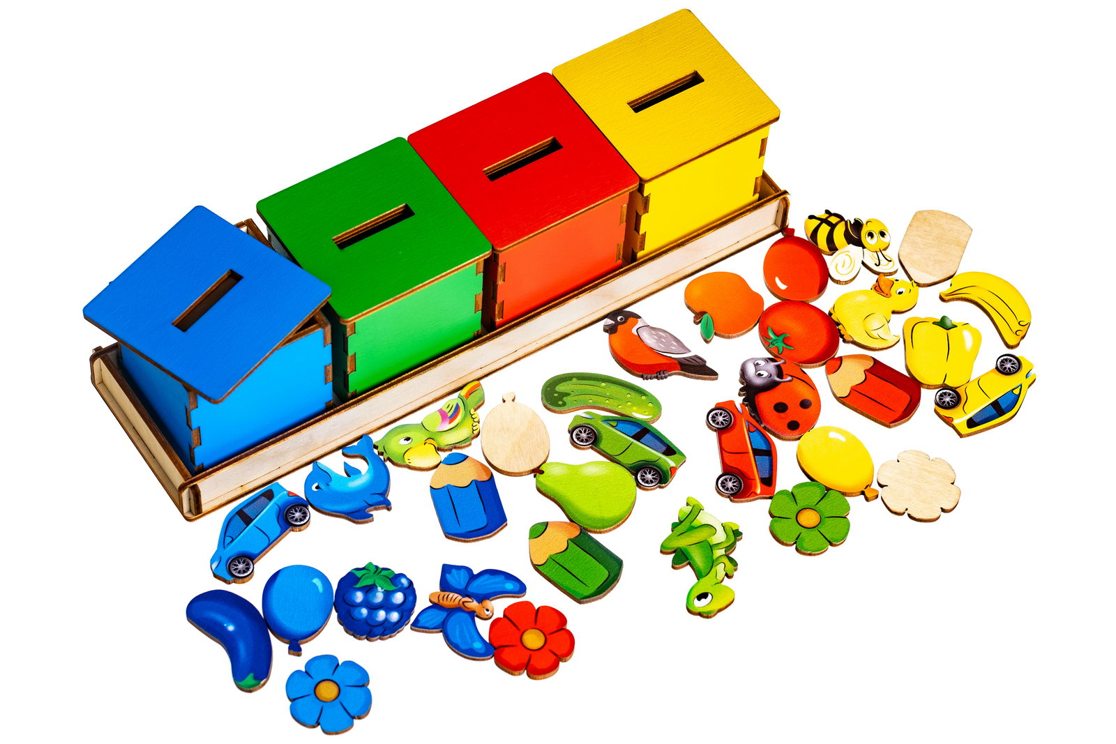 1. Игра «Цветные домики». Рассмотрите вместе с ребенком цветные коробочки – «домики», предложите назвать цвет каждого «домика». Попросите назвать, какие фигурки спрятаны внутри каждого «домика». Предложите ребенку самостоятельно «заселить» домики цветными фигурками, вставляя их в специальные прорези на крыше «домика».
