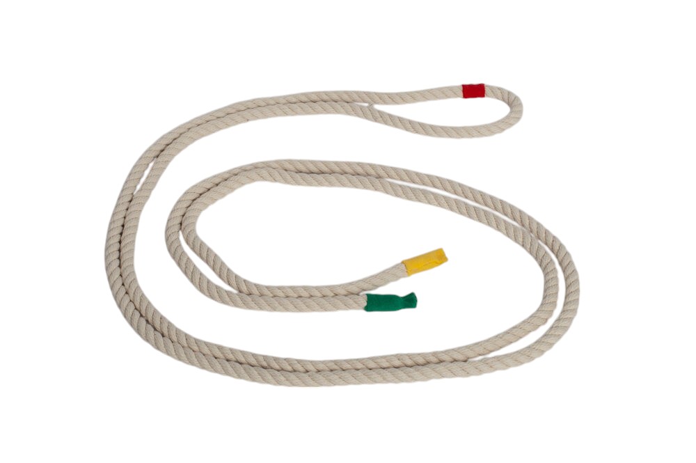 Края запакованы с одной стороны желтым, с другой — зеленым флисом. Сумка под канат со шнурком и фиксатором. Размер: длина каната 3 метра, диаметр - 2 см.
