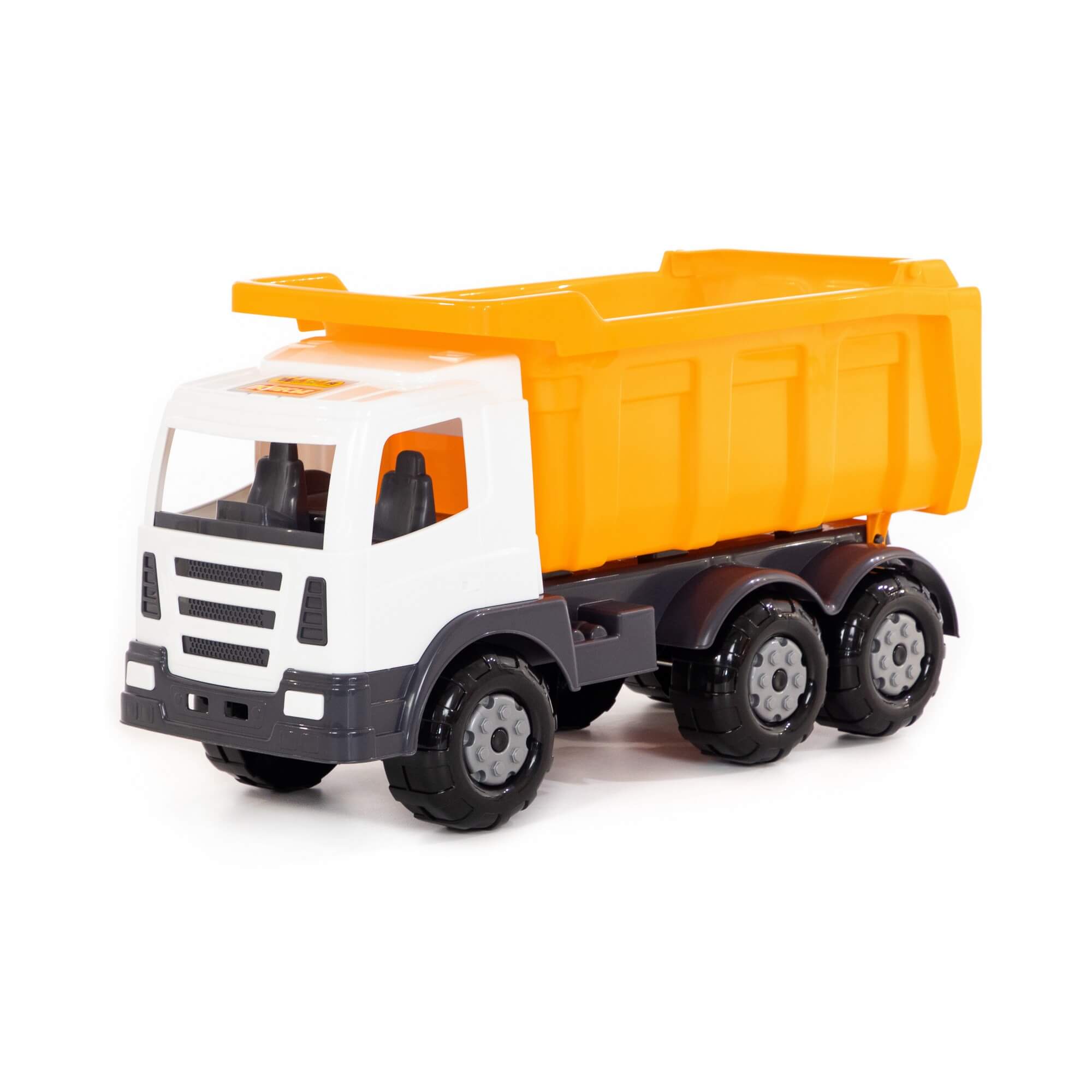 Большой самосвал на трех металлических осях с открывающимся задним бортом для разгрузки. В кузов ребенок сложить все свои песочные принадлежности или детали конструктора, машинки и другие игрушки. В кабину в качестве водителей малыш посадит свои фигурки. Каждый мальчишка желает иметь у себя в автопарке большой самосвал.