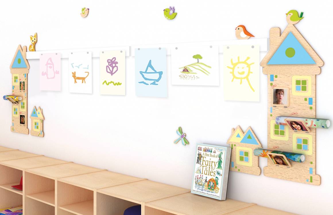 Демонстрационная система разработана для организации выставки детских работ, фотографий, размещения информации и методического материала, которые надежно крепятся магнитами. Комплектация : домик высокий (67х28 см) - 2шт, домик маленький (23х19 см) - 2 шт, магнитная панель (100х7 см) - 2 шт, котик (16х10 см), птичка (13х10 см) - 4 шт, стрекоза (13х10 см)