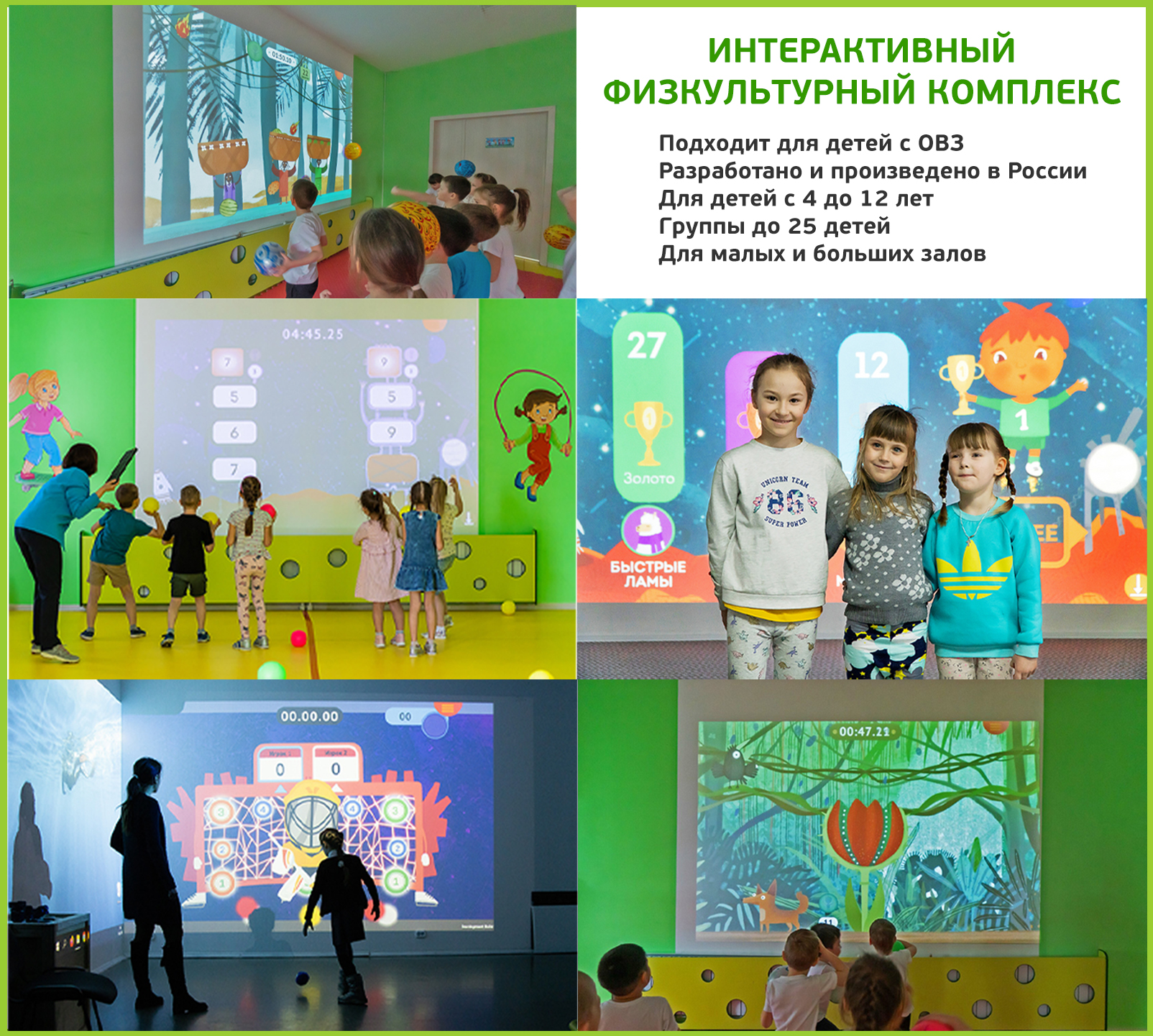 Интерактивный физкультурный комплекс - проекционное борудование для проведения занятий по физкультуре с помощью стены и нажатий рукой, мячом, шайбой или другими предметами. Это продукт, совместивший популярные виды спорта, образовательные технологии и сенсорную стену. Упражнения и методические рекомендации составлены с акцентом на безопасность и гармоничный дизайн.