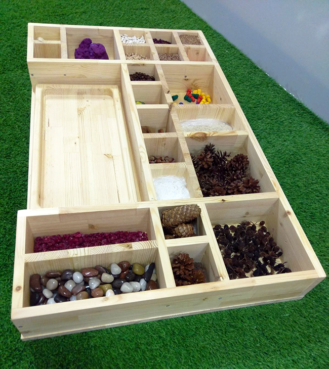 Стол из натурального дерева разбитый на 22 ячейки различных форм. В каждой из которых - наполнители различных форм, фактуры и цветов. Используется в работе психолога, творческих мастерских, реабилитации пациентов с различными расстройствами.