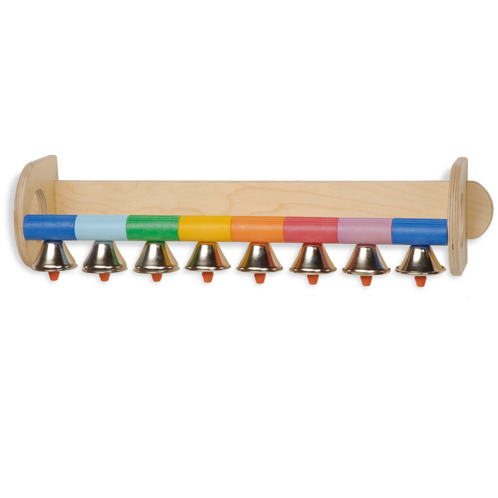 8 колокольчиков с разными нотами, на которых можно играть мелодию пальцами или всей рукой. Каждому звуку присваивается цвет. Колокольчики закрепелены на настенном деревянном каркасе.