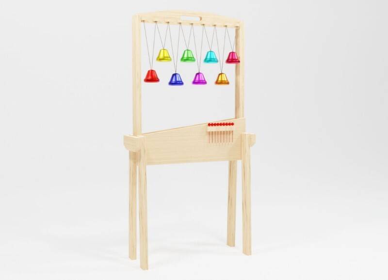 Музыкальная панель предназначена для развития тактильных и музыкальных чувств детей, выполнена в виде ширмы с подвешенными разноцветными колокольчиками и подставкой для палочек.