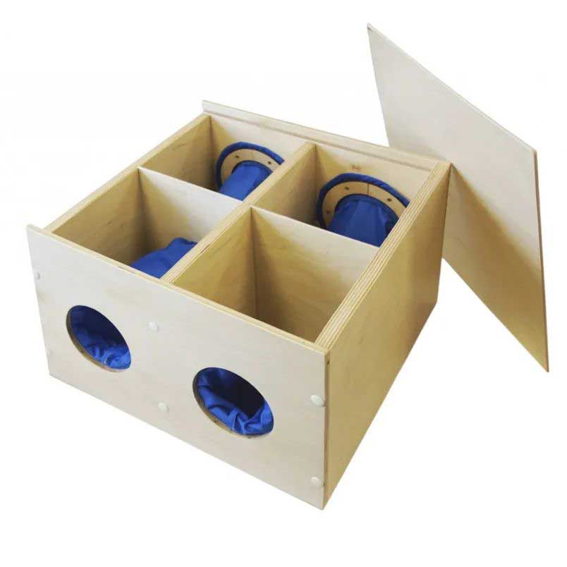 Изделие представляет собой ящик с крышкой, внутри которого расположены перегородки, разделяющие ящик на 4 зоны. На боковых стенках ящика расположены отверстия, которые имеют текстильные рукава. К изделию пролагаются шарики различного диаметра и фактуры