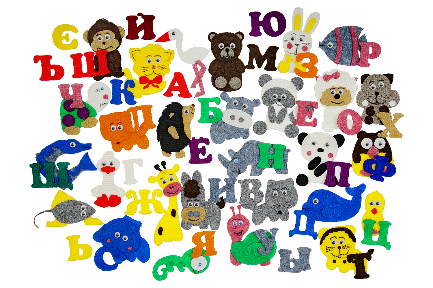 Поле 28*45см, полный комплект букв русского алфавита в количестве 33 шт., бегемот, волк, енот, ёж, жираф, ишак, котик, лиса, медведь, носорог, овечка, панда, слон, тигр, хомяк, черепаха, шимпанзе, сыр с мышкой, аист, гусь, филин, цыпленок, улитка, ящерица, дельфин, рыбка, щука. Фигурки от 4*4см до 10*12см.