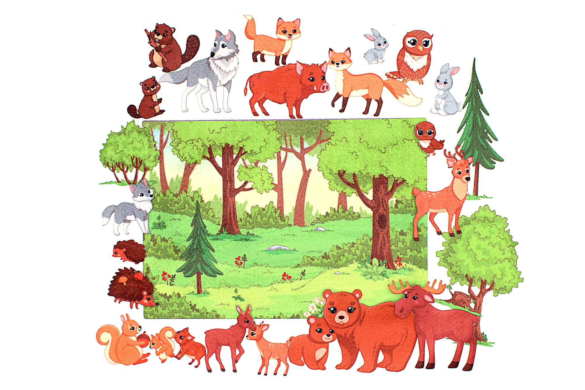 Игровое поле с карманом 28*20см, Животные с детенышами, Два дерева и пень. Фигурки на липучках. От 3х2 до 8х8см.