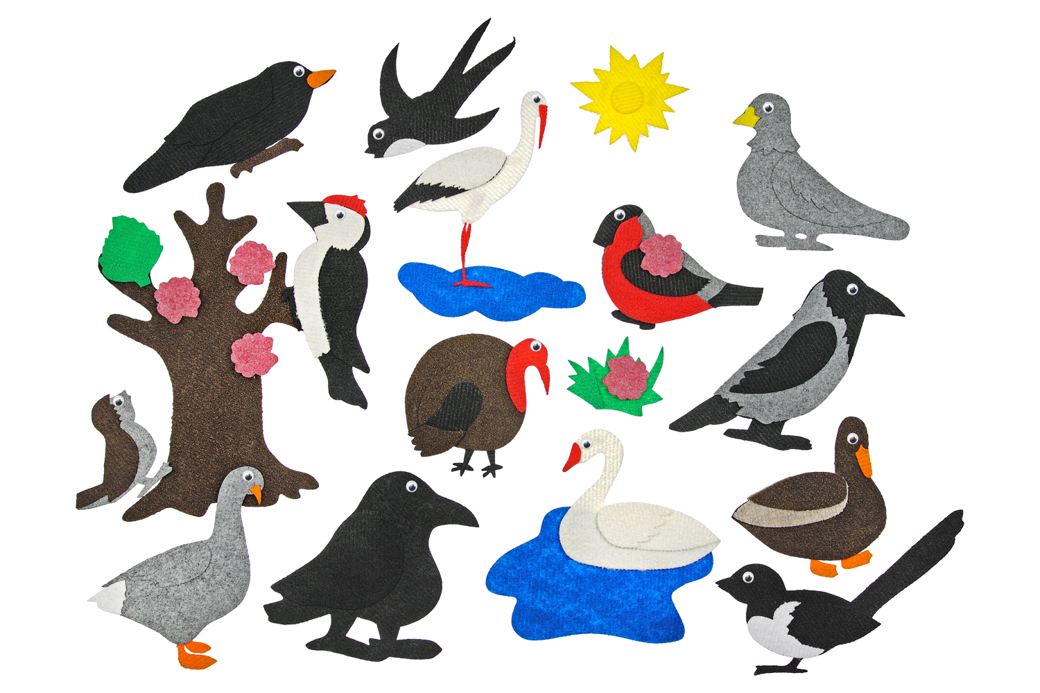 Дерево 25*25см, озеро, трава, цветочки, туча, солнце, гусь, утка, аист, индюк, ворон, ворона, ласточка, дятел, воробей, сорока, голубь, снегирь, лебедь, дрозд, синица. Фигурки от 3*3см до 20*20см.