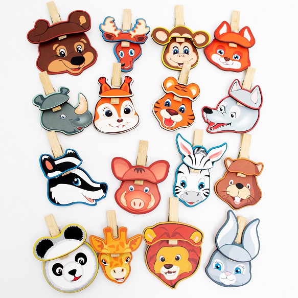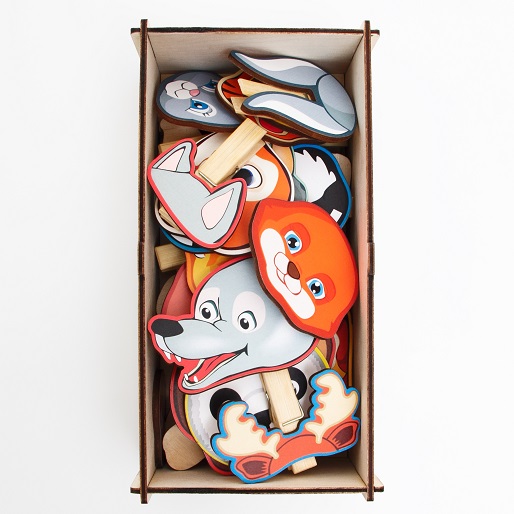 Детали (голов диких животных), прищепок (в виде ушей диких животных) и деревянной коробочки для их хранения. Коробочку можно дополнительно использовать как материал для игры, разбирать и складывать обратно, развивая логику и мелкую моторику.
