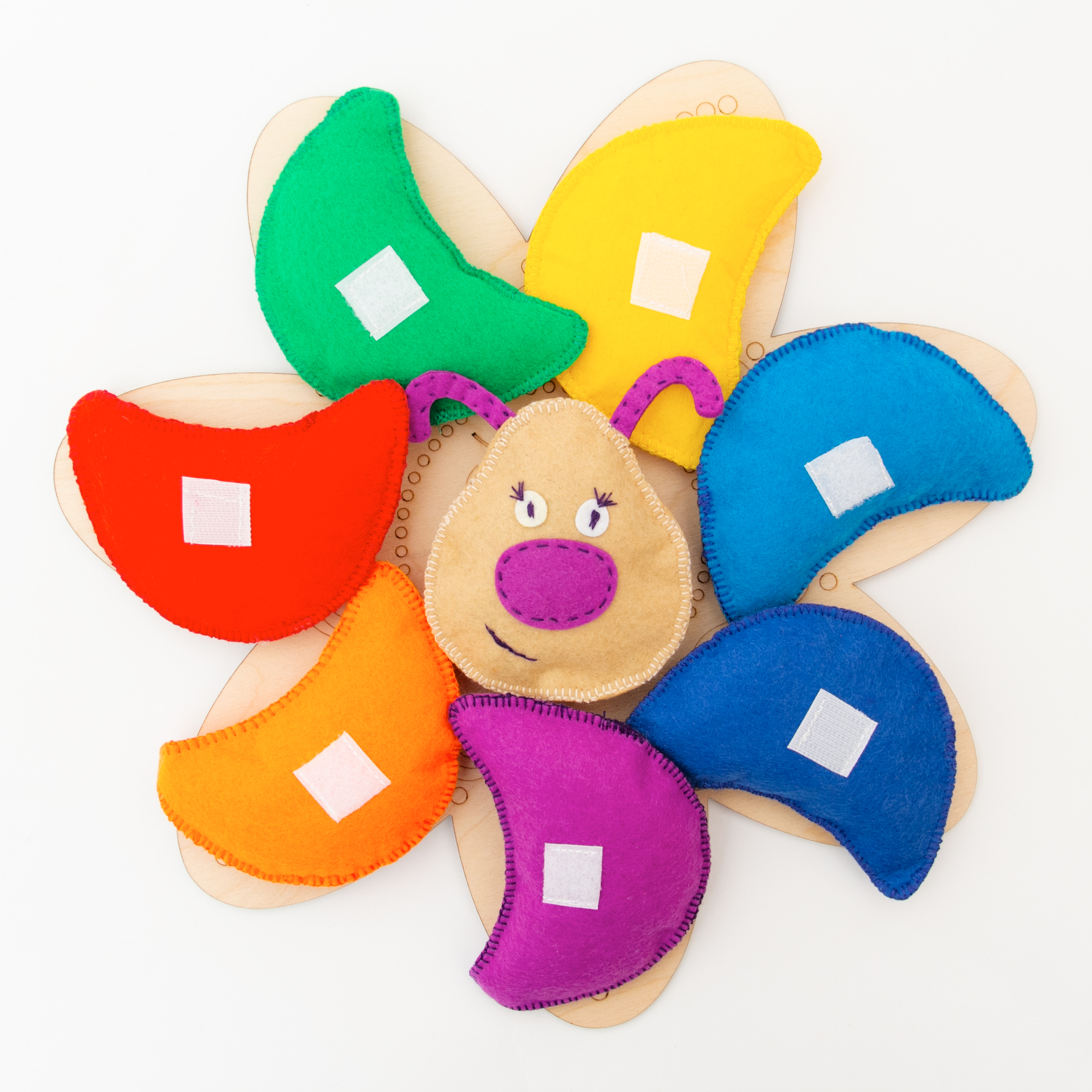 Гусеница, это яркая, приятная игрушка, которая состоит из объемных дисков разных цветов – туловище гусеницы и головы, на липах. Игрушка прикрепляется к деревянной платформе в форме цветка, с помощью лип. Фетровая игрушка способна привлечь внимание ребенка, удивить и подарить радость от игры. Это безопасный, прочный, теплый и приятный на ощупь материал. Самым важным в фетровых игрушках является огромный потенциал для сенсорного развития ребенка. Окружающий мир входит в сознание ребенка лишь через дверь органов чувств – зрение, слух, осязание, вкус и обоняние. Игрушки из фетра способны одновременно активизировать различные каналы восприятия ребенка, включенные в игровую деятельность: