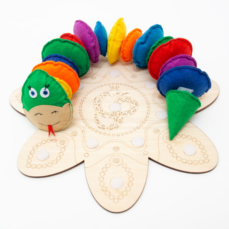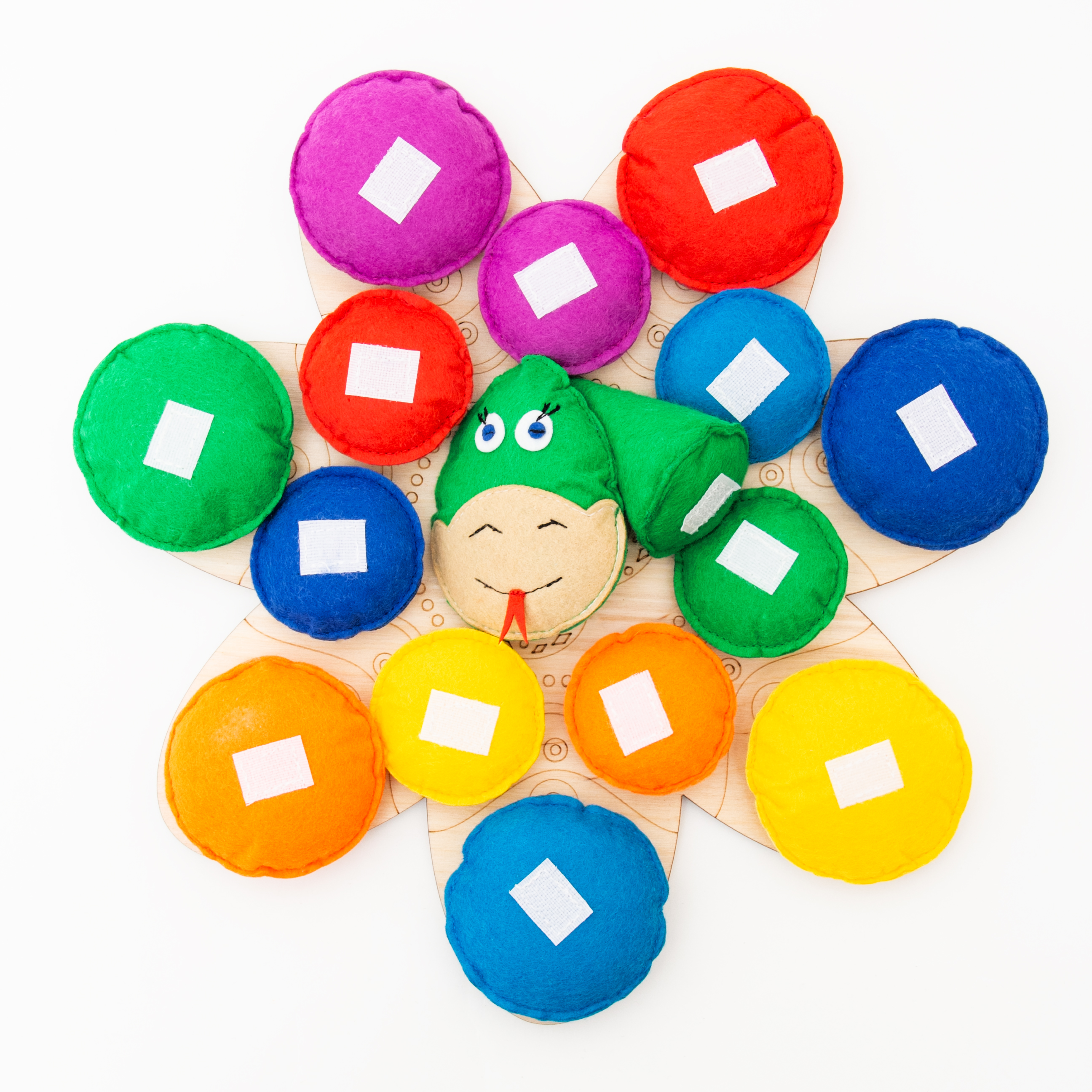 Радужная змея, это яркая, приятная игрушка, которая состоит из объемных дисков разных цветов – на липах. Игрушка прикрепляется к деревянной платформе в форме цветка, с помощью лип. Фетровая игрушка способна привлечь внимание ребенка, удивить и подарить радость от игры. Это безопасный, прочный, теплый и приятный на ощупь материал. Самым важным в фетровых игрушках является огромный потенциал для сенсорного развития ребенка. Окружающий мир входит в сознание ребенка лишь через дверь органов чувств – зрение, слух, осязание, вкус и обоняние. Игрушки из фетра способны одновременно активизировать различные каналы восприятия ребенка, включенные в игровую деятельность: