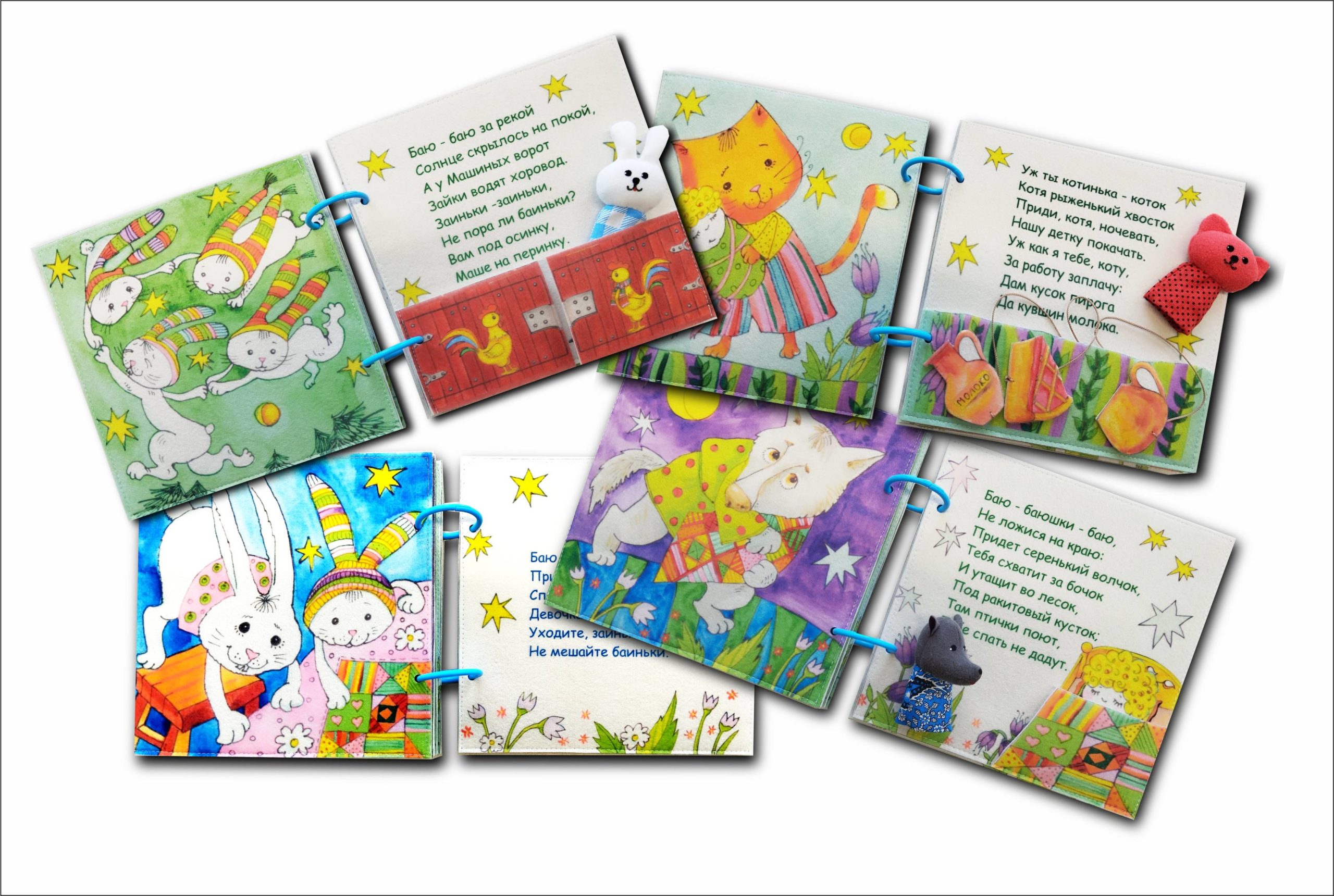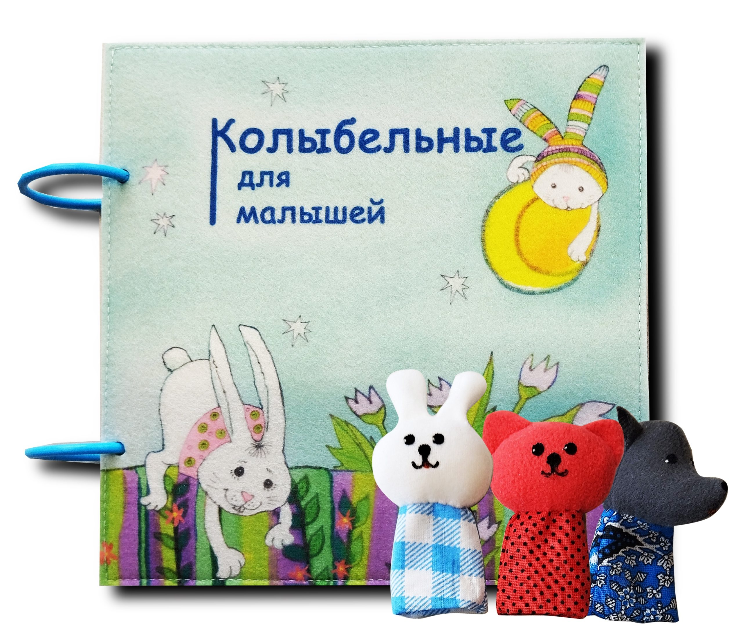Книжка «Колыбельные для малышей» изготовлена из фетра. Рисунок выполнен методом сублимационной печати. Имеет навесные элементы, открывающиеся воротца, отгибающийся кармашек, светящуюся звездочку. Яркие детали книжки привлекают внимание и развивают мелкую моторику малыша.