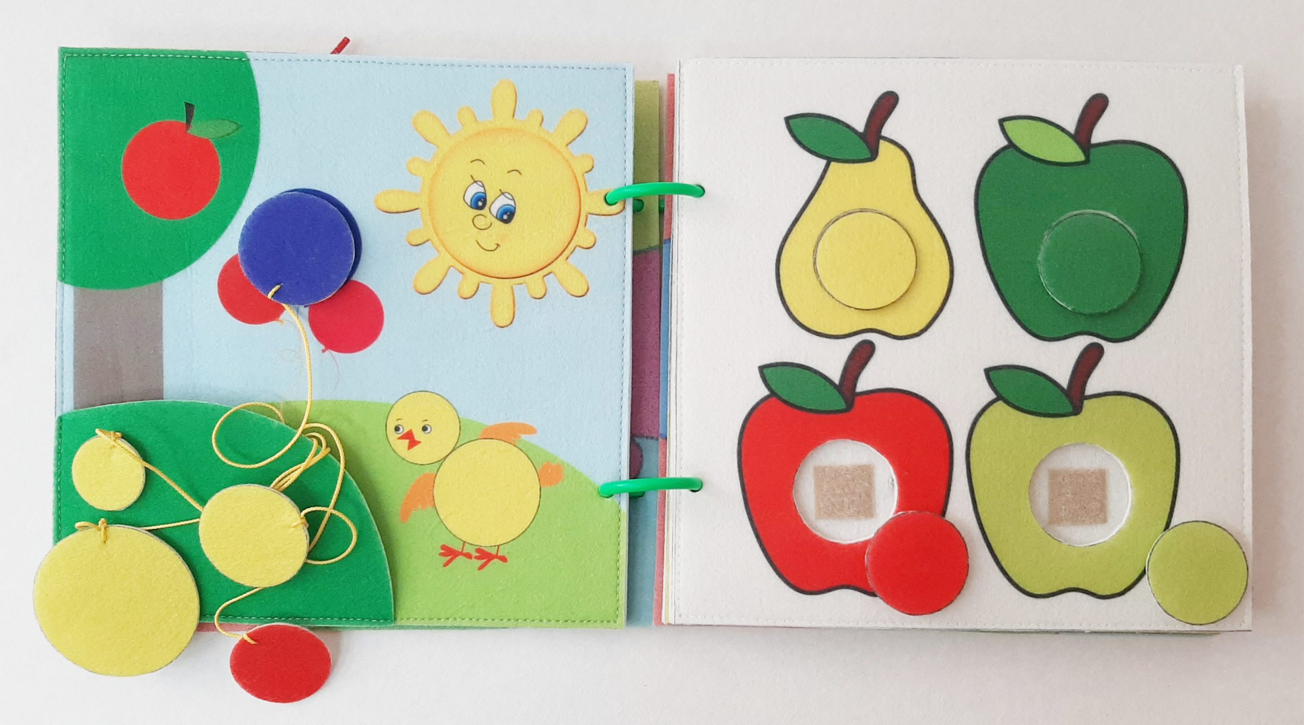 Игровая многофункциональная книжка «Поиграем 1» изготовлена из фетра. Рисунок выполнен методом сублимационной печати. Страницы соединены разборными кольцами, что позволяет играть с каждой страницей книжки отдельно. Книжка имеет навесные элементы на липучках, пуговках и шнурках.