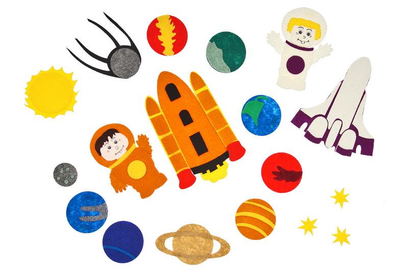 Космонавт-2 шт., космический корабль-2 шт., спутник, звезда-3 шт., планеты: Солнце, Земля, Нептун, Марс,Юпитер, Луна, Венера, Меркурий, Сатурн, поле 25*35см. Фигурки от 2*2см до 17*20см.