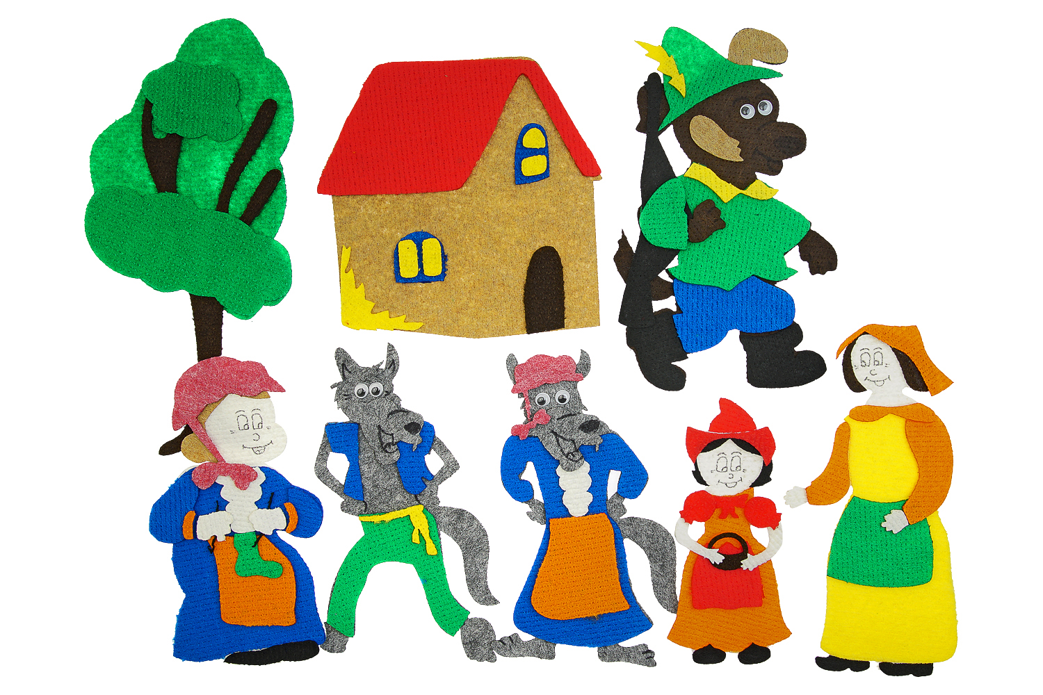 Игровое поле 25*35см, дом, дерево, красная шапочка, матушка, волк, волк в образе бабушки, бабушка, охотник. Фигурки от 12*6см до 25*20см.