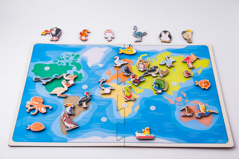 Отправляйтесь в Кругосветное путешествие с ребенком. Для начала рассмотрите фигурки птиц, складывая их на панель карты. Расскажите о птицах. О том, кто, где живет, об их повадках.