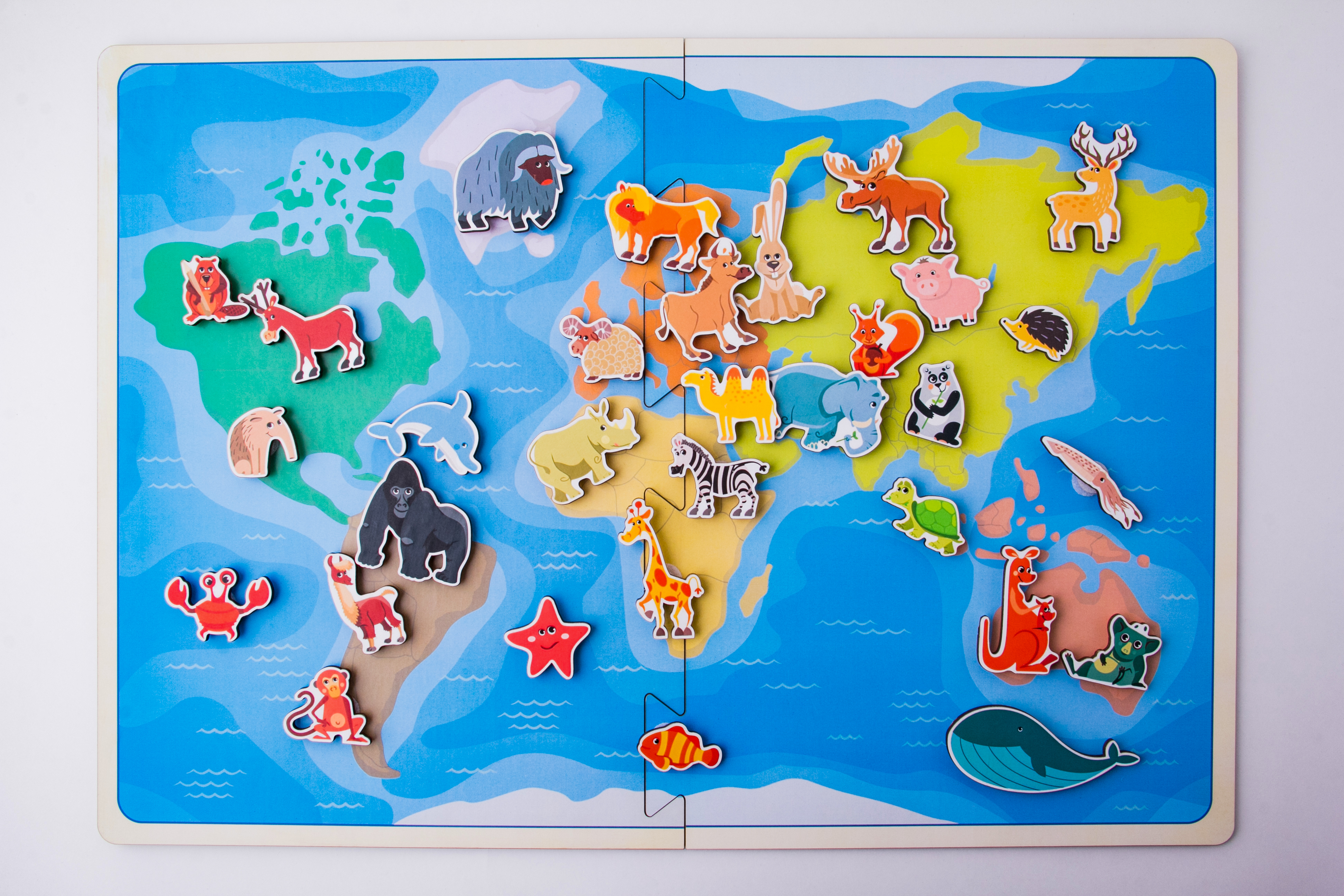 Отправляйтесь в Кругосветное путешествие с ребенком. Для начала рассмотрите фигурки животных, складывая их на панель карты. Расскажите о травоядных животных. О том, кто, где живет, об их повадках.