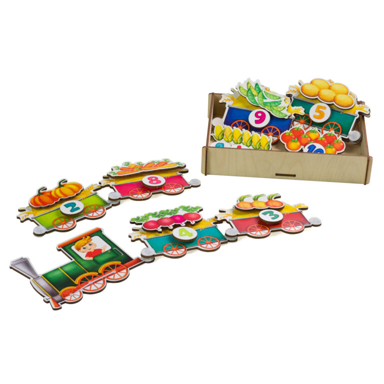 Наклейте на вагончики цифры. Машинист повез на паровозике овощи в город. Давай положим в вагончик с цифрой один – одну капусту, а с цифрой два – две тыквы. А в вагончик с цифрой три, что мы положим? Правильно три лука. Поехал паровозик. Таким образом, можно разложить все овощи по вагонам. В этой игре мы формируем понимание и умение соотносить количество и цифру до десяти. Как на первом рисунке ниже.