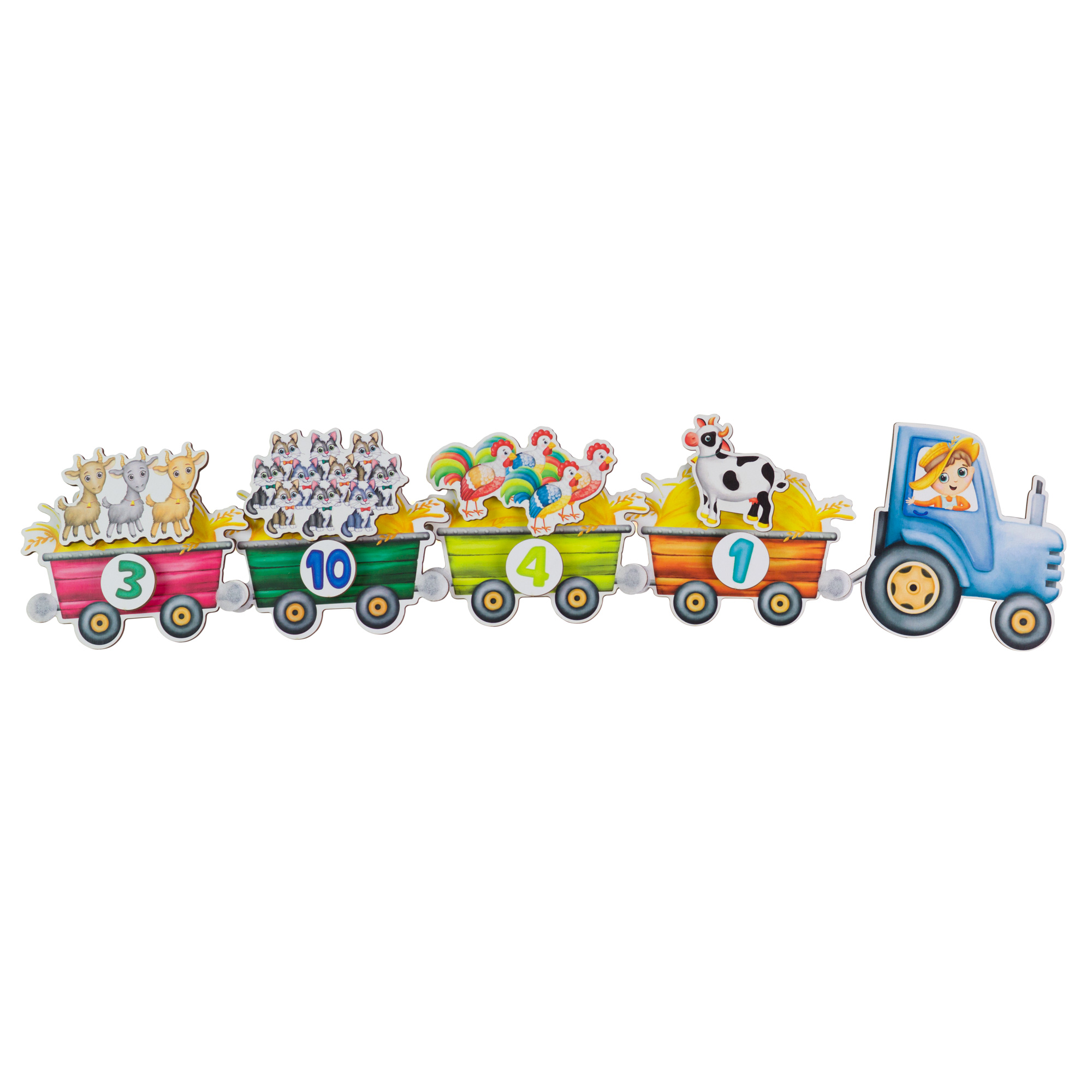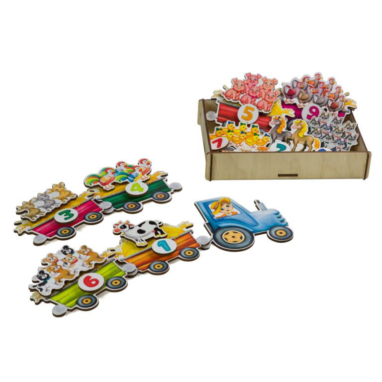 Наклейте на прицепы к трактору цифры. Фермер повез на тракторе животных на ферму. Давай посадим в прицеп с цифрой один – одну корову, а с цифрой два – две лошадки. А в прицеп с цифрой три кого мы посадим? Правильно трех козлят. Поехал трактор. Таким образом, можно рассадить всех деревенских животных. В этой игре мы формируем понимание и умение соотносить количество и цифру до десяти. Как на первом рисунке ниже.