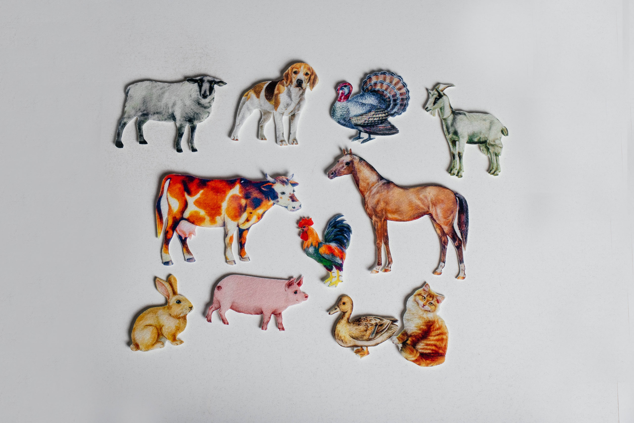 В наборе – основные домашние животные. Это – корова, петух и индюк, коза, кролик, свинья, собака, утка, кошка, лошадь, овца. Каждое животное снабжено липучкой (лентой Velcro). Данный набор подходит для работы с игровым полем.