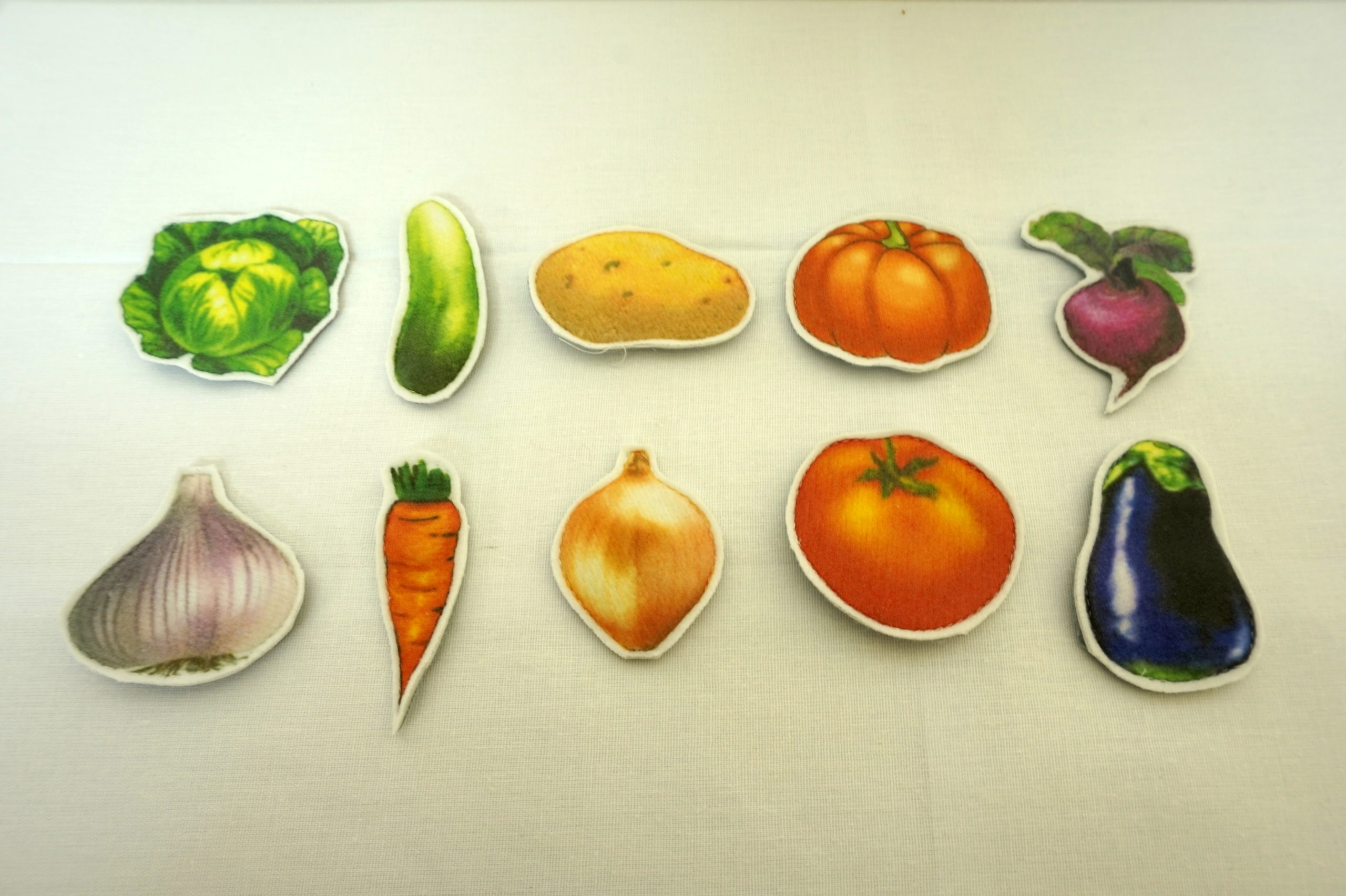 В наборе — капуста, морковь, чеснок, огурец, картошка, лук, помидор, тыква, свекла, баклажан. Каждая фигура снабжена липучкой (лентой Velcro). Данный набор подходит для работы с игровым полем.
