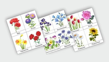 В наборе – Колокольчик, Мак, Астра, Василек, Нарцисс, Гвоздика, Тюльпан, Ирис, Роза, Ромашка, Подсолнух, Виола (Анютины глазки). Карточки можно разрезать. Данный набор подходит для работы с игровым полем, для этого к каждой карточки вложена липучка.