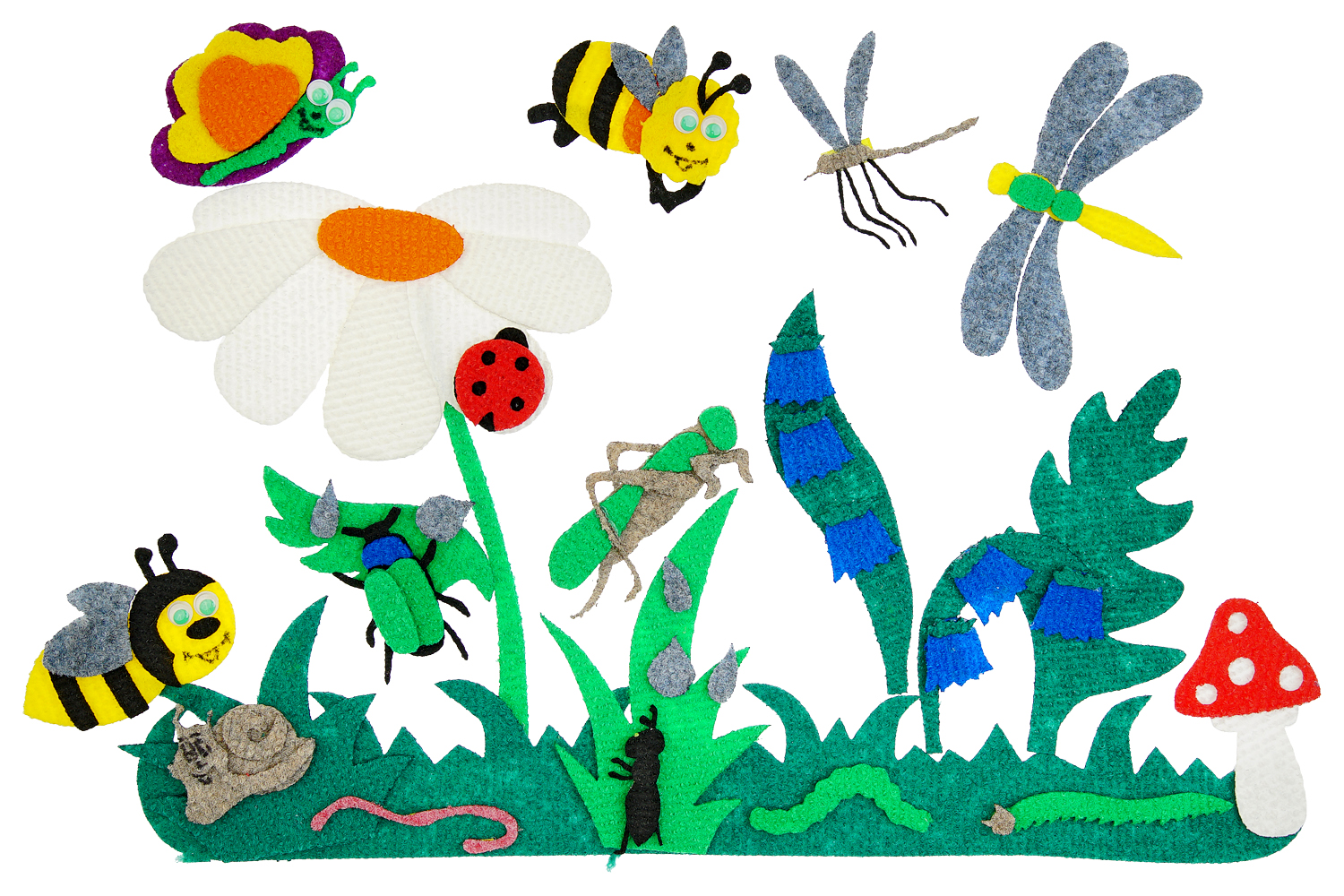 Трава,роса, колокольчики, ромашка, бабочка, гусеница, червяк, улитка, оса, пчела, божья коровка, кузнечик, стрекоза, комар, жук, муха, муравей, мухомор.Фигурки от 2*2см до 20*17см. поле 28*45